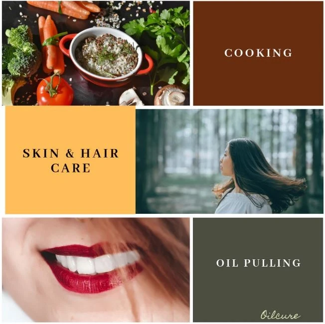 Dental health: “Oil pulling” is very common. It basically involves putting the oil in your mouth, nicely rinsing inside and spitting it out. You can use sesame oil once a day to rinse and wash your mouth. This will brighten and make your teeth whiter, prevent plague, cavities, make gums healthier.