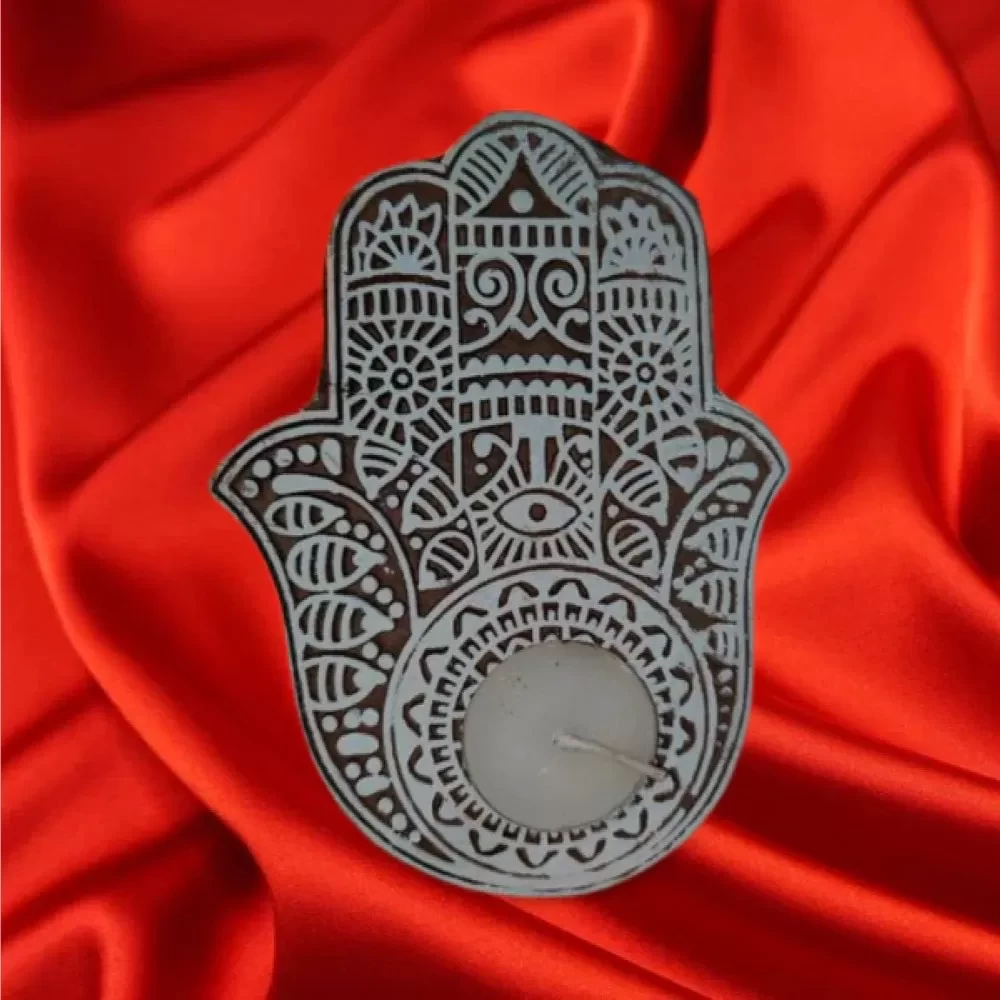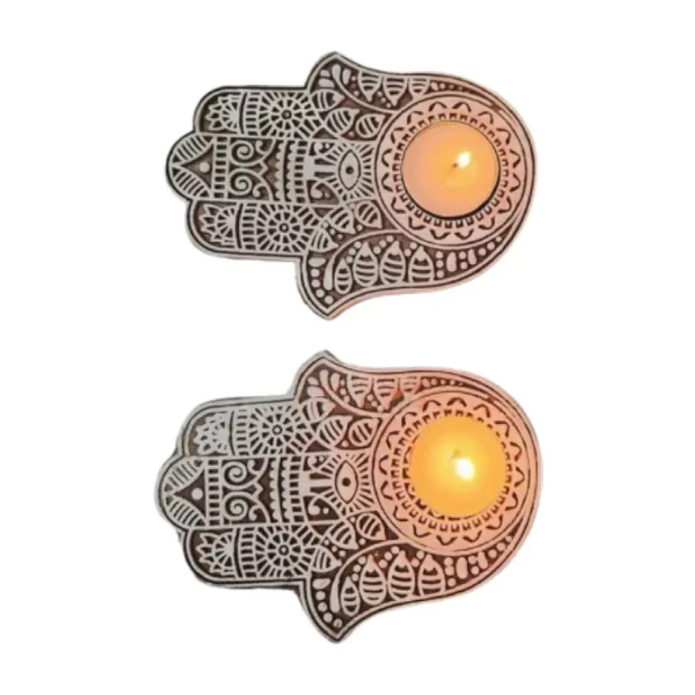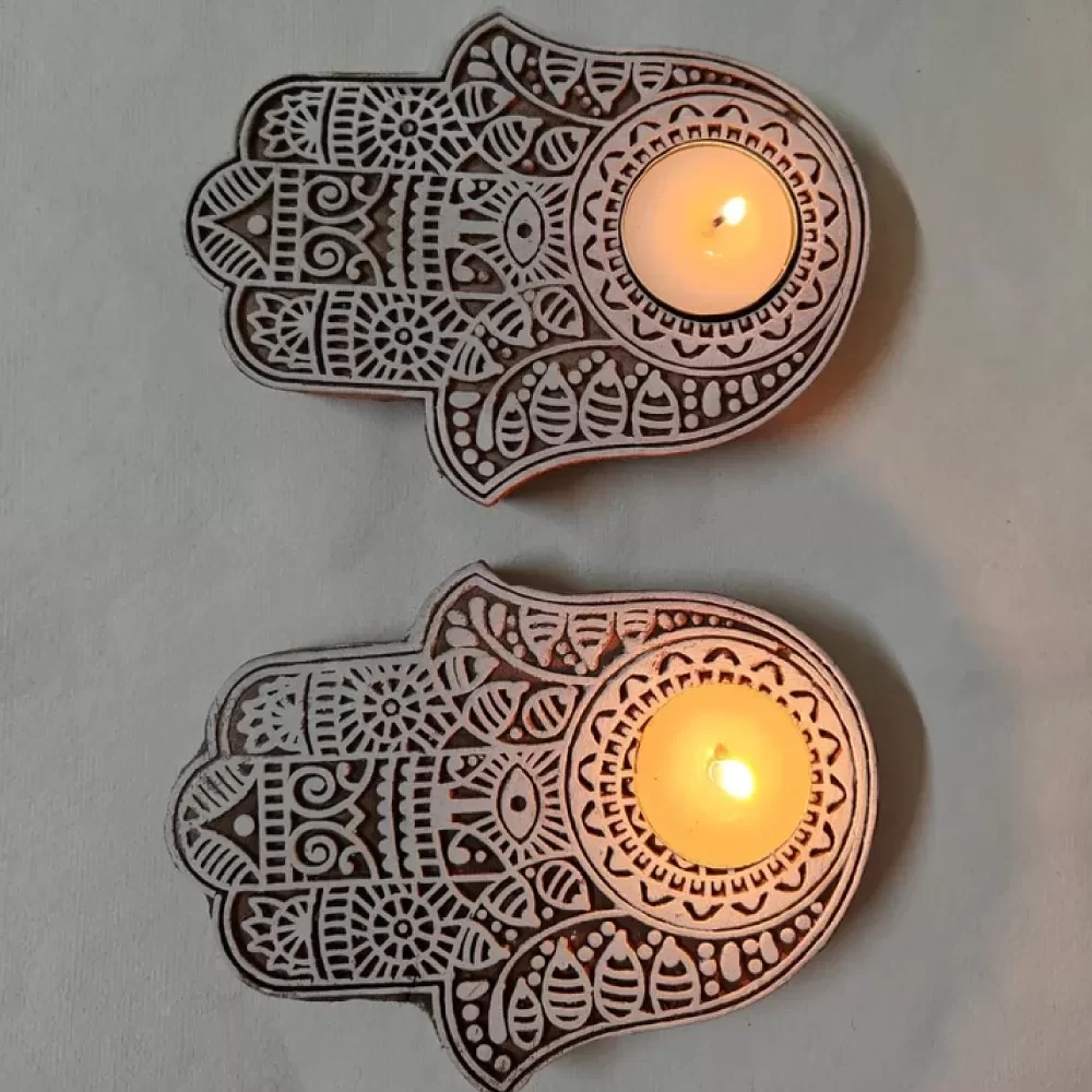 Beautifully hand crafted set of two tea light holder, made up of pure Jamun wood, light weighted. Makes your home stylish and elegant. These hamsa hands are sign of protection power and strength. It's believed to protect against all negative energies.