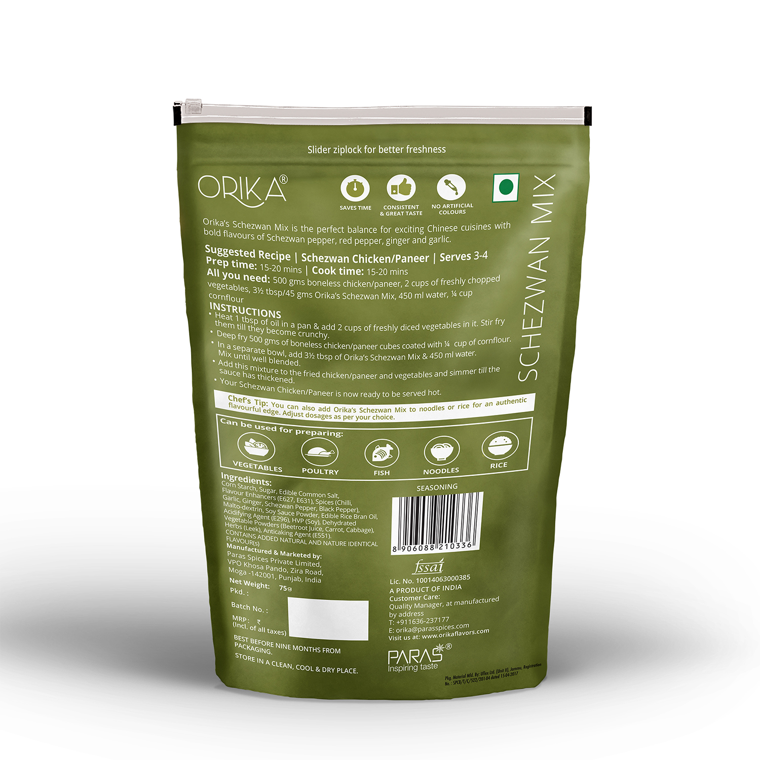 Your cravings for piping hot Chinese meals come to an end with Orika’s Schezwan Mix Seasoning. A poignant combination of the precious Schezwan pepper, red chili, ginger and garlic, it adds just the right amount of tanginess and spiciness to all your dishes, stewed, seared or stir fried. With the Schezwan mix seasoning on your side, be assured to cook up a storm when it comes to putting up the most mouth watering Chinese menu on the table!