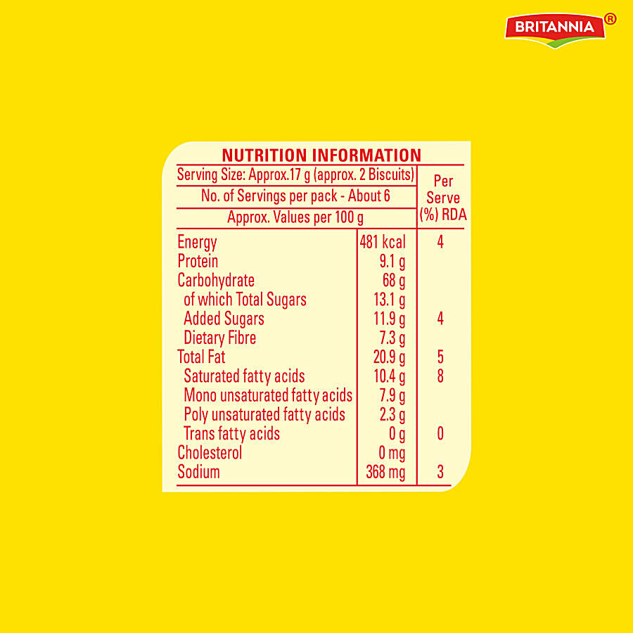 Britannia NutriChoice Digestive Biscuits are fibre-rich biscuits packed with the goodness of wheat flour (atta) and bran. With every bite, you can experience the coarseness of this fibre-rich, healthy biscuit. These Digestive cookies are baked to perfection, making them a perfect healthy snack.
