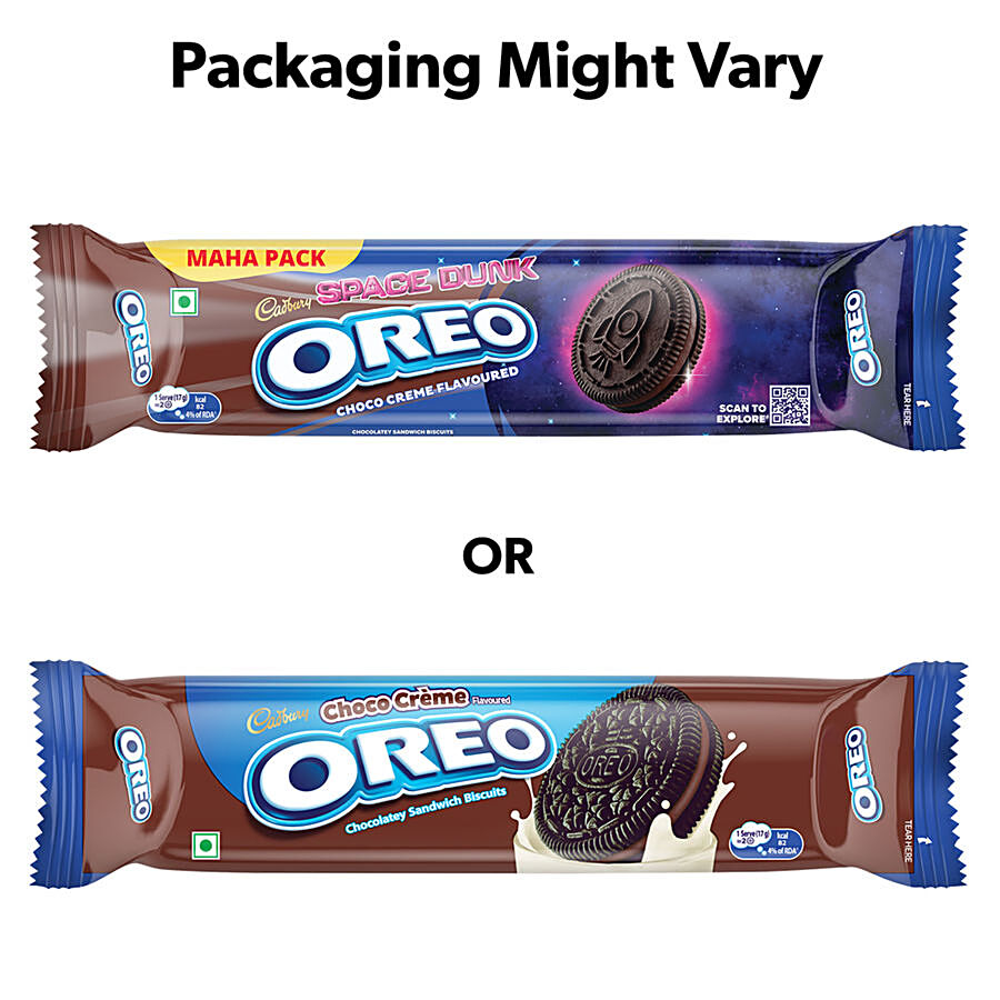 OREO: milk's best friend for over 100 years! Cadbury OREO Chocolate creme sandwich biscuit consists of two chocolatey biscuits with a rich chocolate creme filling between them. Cadbury OREO creme biscuits are made with cocoa, which defines their unique chocolatey flavour. Add this crunchy delight to your snacks and gift yourself rich and smooth joy. OREO biscuits are perfect for snacking or enjoying as a treat at any time of the day. Twist, lick and dunk! Enjoy OREO sandwich cookies with a glass of milk or add them to your favourite recipes such as cakes and milkshakes! Add a scoop of vanilla ice cream to OREO biscuits to make your own creamy dessert! Available in single & family/ combo packs. This biscuit pack is suitable for vegetarians