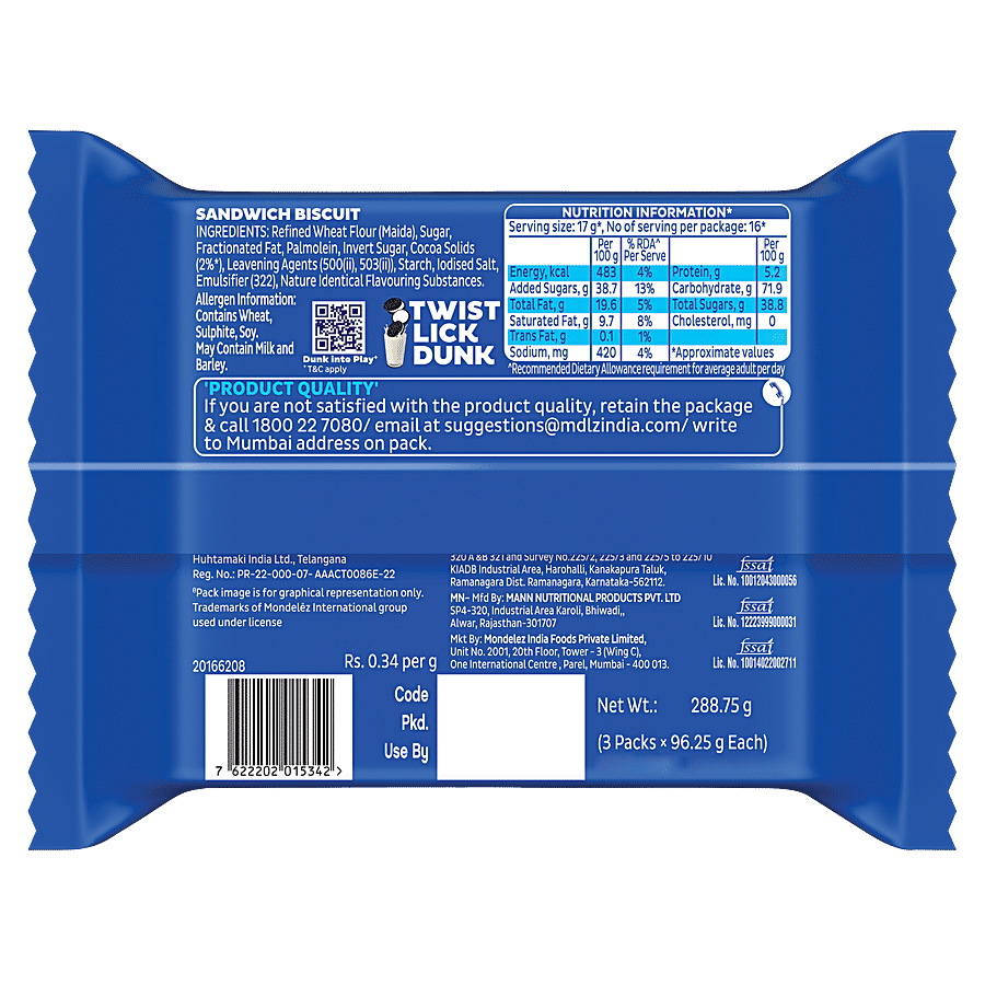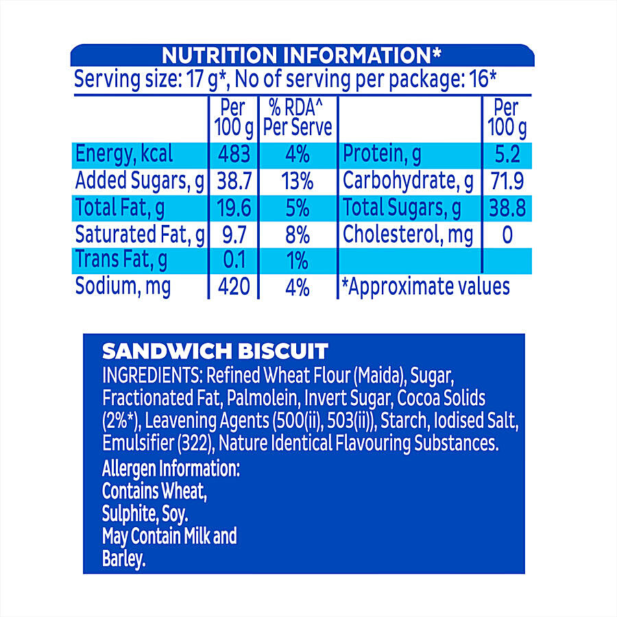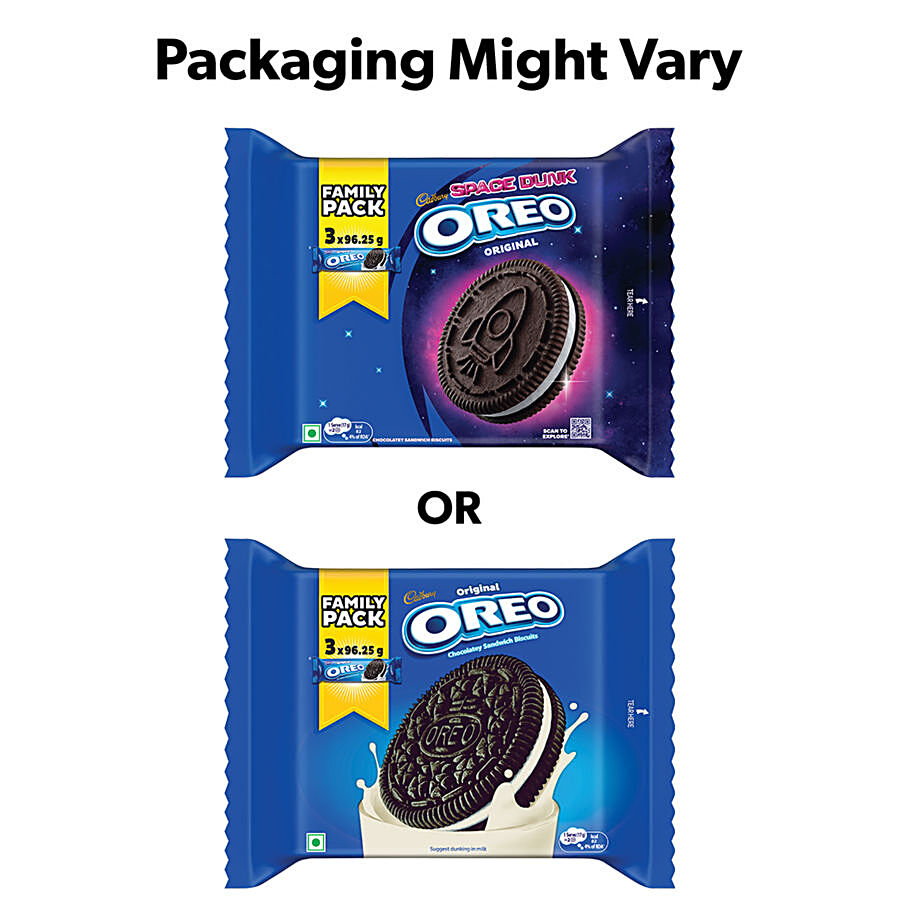 OREO: milk's best friend for over 100 years! Cadbury OREO Vanilla creme sandwich biscuit consists of two chocolatey biscuits with a rich vanilla creme filling between them. Cadbury OREO creme biscuits are made with cocoa, which defines their unique chocolatey flavour. Add this crunchy delight to your snacks and gift yourself rich and smooth joy. OREO biscuits are perfect for snacking or enjoying as a treat at any time of the day. Twist, lick and dunk! Enjoy OREO sandwich cookies with a glass of milk or add them to your favourite recipes such as cakes and milkshakes! Add a scoop of vanilla ice cream to OREO biscuits to make your own creamy dessert! Available in single & family/ combo packs. This biscuit pack is suitable for vegetarians.