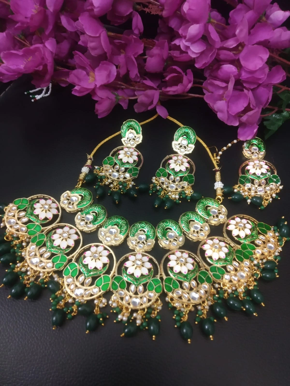 Paired with the necklace are elegant earrings and a matching Tika, completing the ensemble with grace and sophistication. The Meenakari detailing adds a pop of color, enhancing the overall allure of the set and making it a perfect choice for festive occasions, weddings, or any celebration that demands a touch of opulence.
