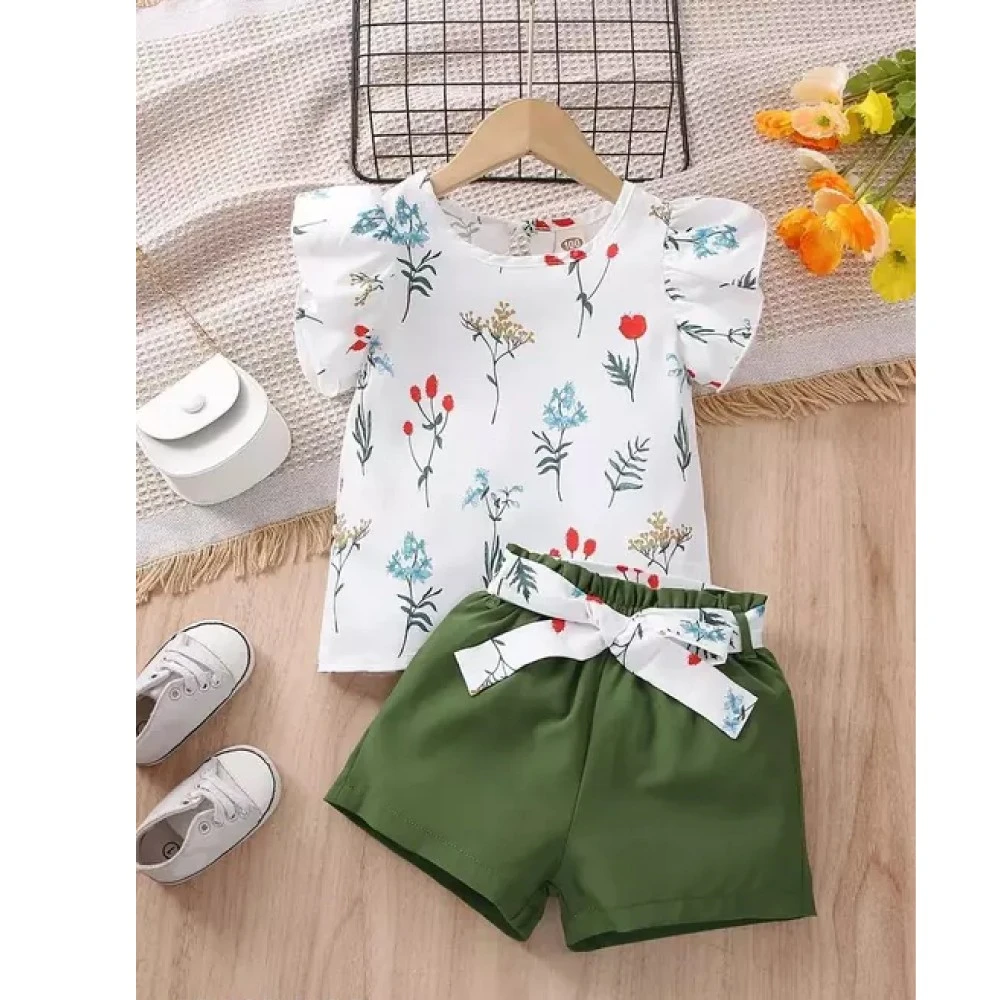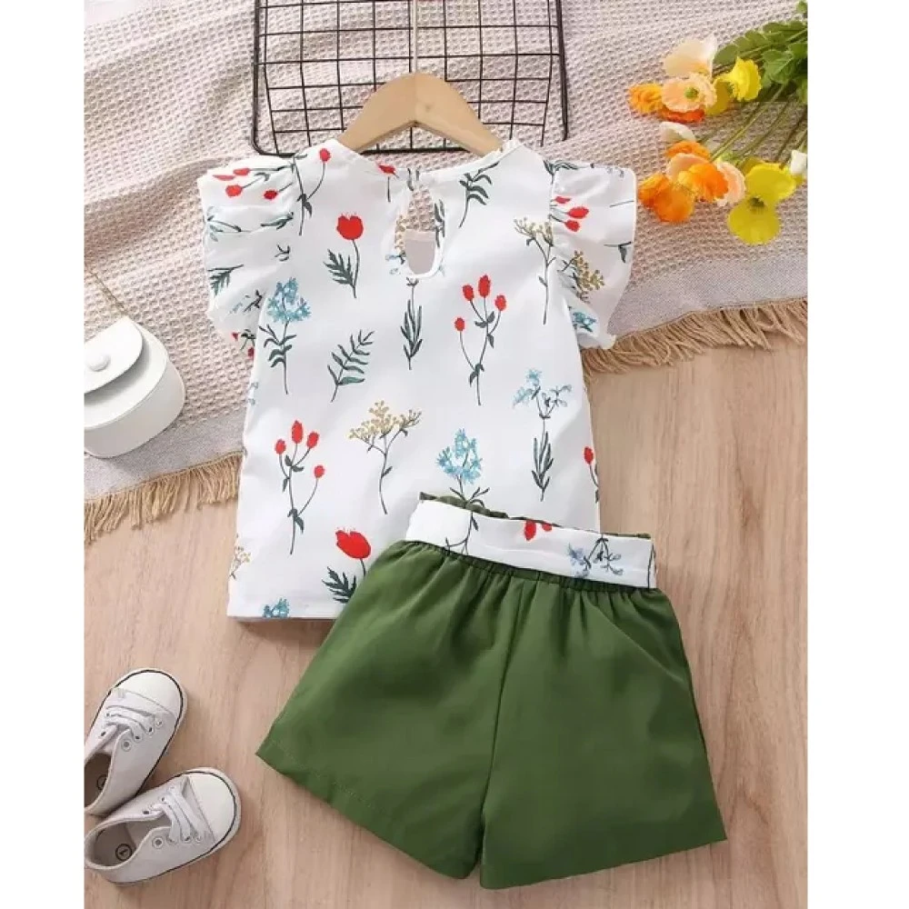 Prince Hosiery Floral Printed Top and Short with Belt Pack of 1 Green and White
