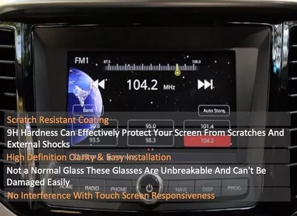ULTIMATE PROTECTION AND USABILITY: Our Premium Screen Protectors are designed to protect your device screen against impact, scratches, dust and fingerprint smudges. Manufactured from a high quality chemically treated guards, the screen protectors are lightweight, thin but most importantly, extremely protective. After lot of experiment Team have finally developed a technique where major problems like Rainbow Effect, Dust Particles entering from sides, Weak Adhesion, Less responsiveness have been removed completely. HARDNESS: Industry-high hardness: Effectively resists scratches up to 9H (harder than a knife). OLEOPHOBIC COATING: The Oleophobic coating built into these screen protectors is a special oil-repellant coating which prevents oily fingermarks from sticking to the screen, so that they can be easily wiped off without leaving hard to remove dried on smudges. EASY INSTALLATION: Due to their solid nature, tempered glass screen protectors are much easier to fit and less error prone than standard screen protectors. Also, we have included range of accessories which smoothens the installation process 9H hardness glass maximum protection from high-impact screen protector are premium protection for the delicate screen on your car infotainment systems, The display protector is made of shatter-proof glass, comes with a smudge-proof coating, and application is a snap. Screen guards, processed shield provides extensive protection from outside damages and scratches, including sharp objects like knives and keys and its laser-cut for a perfect fit.