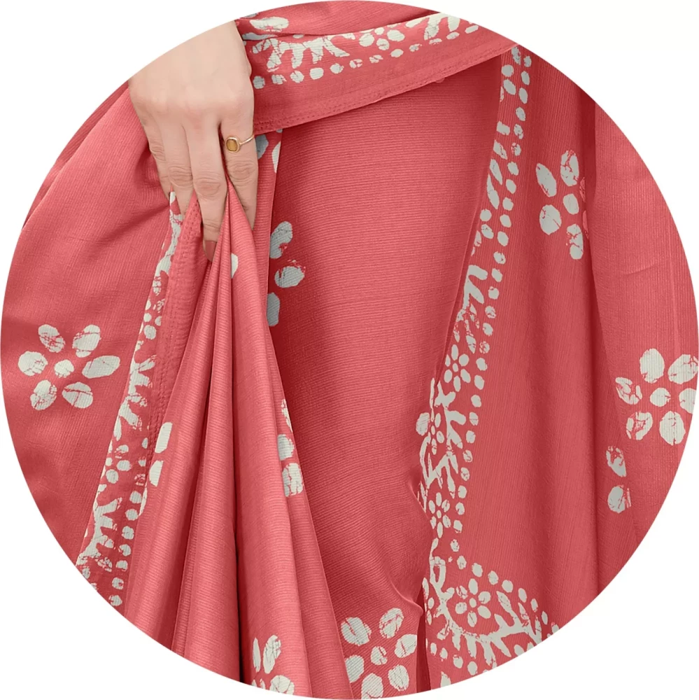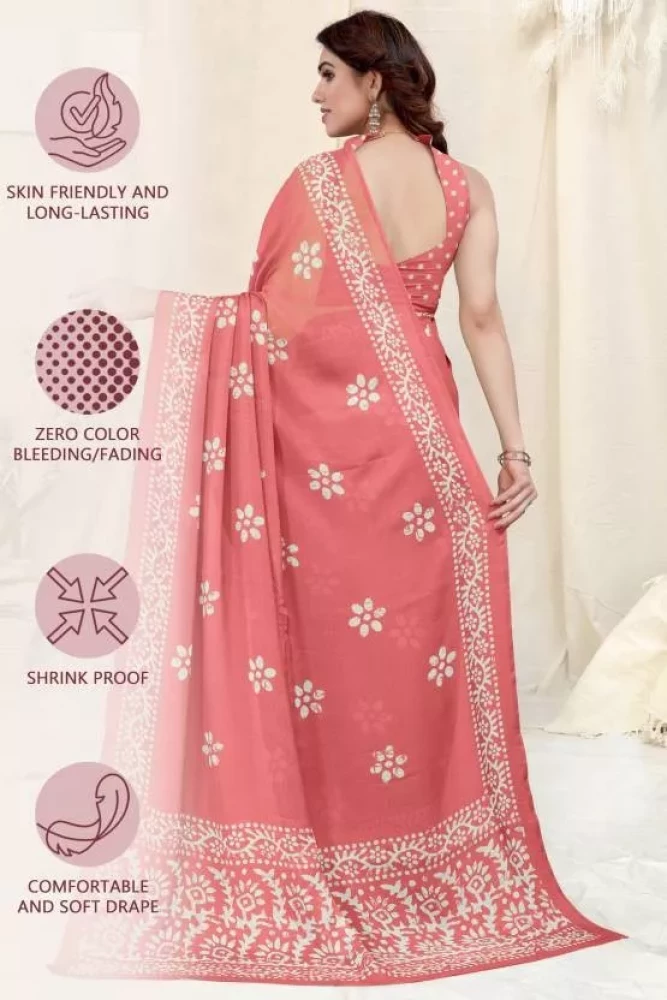 Elevate your casual wardrobe with our Chiffon Batik Printed Peach Saree, perfect for adding a touch of elegance to your everyday look. Crafted from lightweight and breathable chinon shiffon fabric, this saree offers both comfort and style for any occasion.