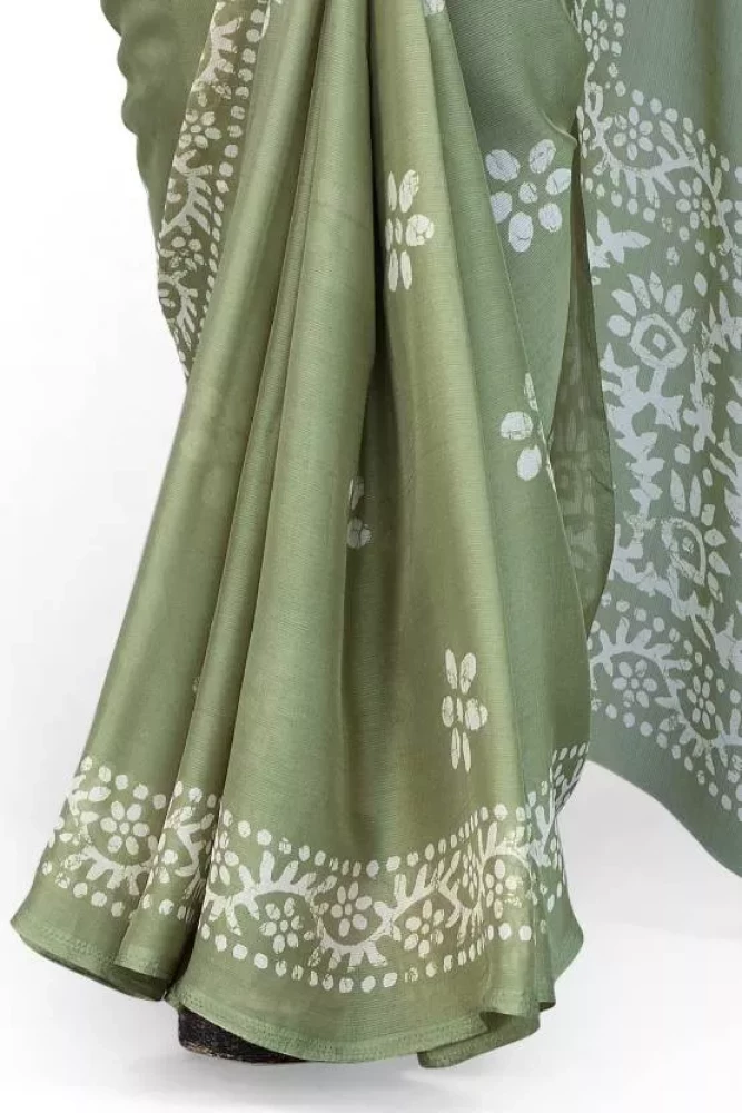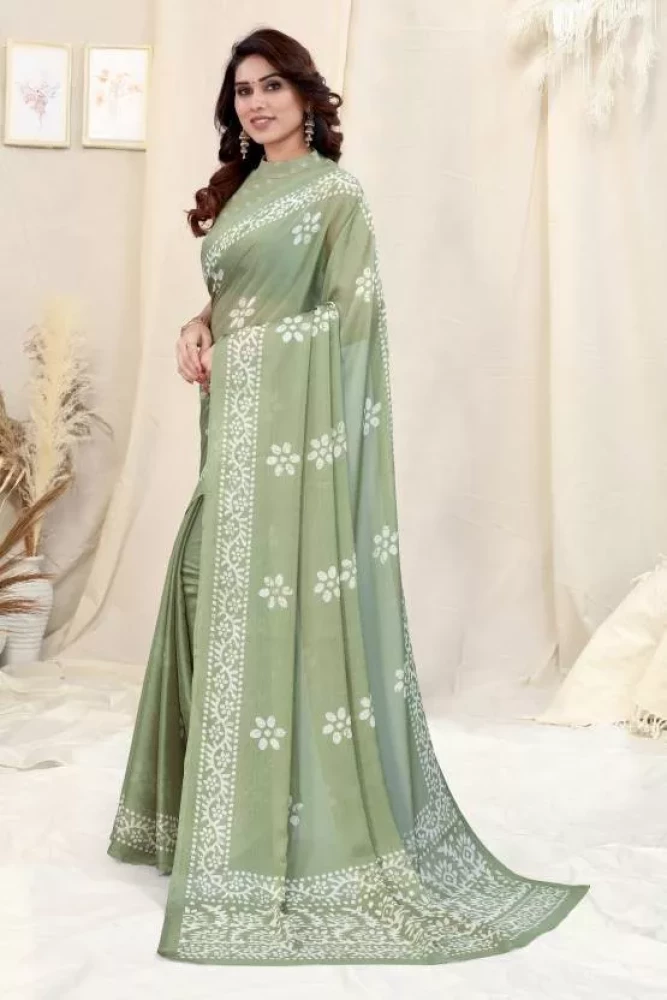 Ideal for everyday wear and relaxed outings, this saree is the perfect choice for adding a touch of elegance to your daily attire. Pair it with minimal jewelry and flats for a laid-back vibe, or dress it up with statement accessories and heels for a more polished look. Whatever the occasion, our Chiffon Batik Printed Pista Green Saree is sure to elevate your style quotient with its effortless charm and timeless appeal.