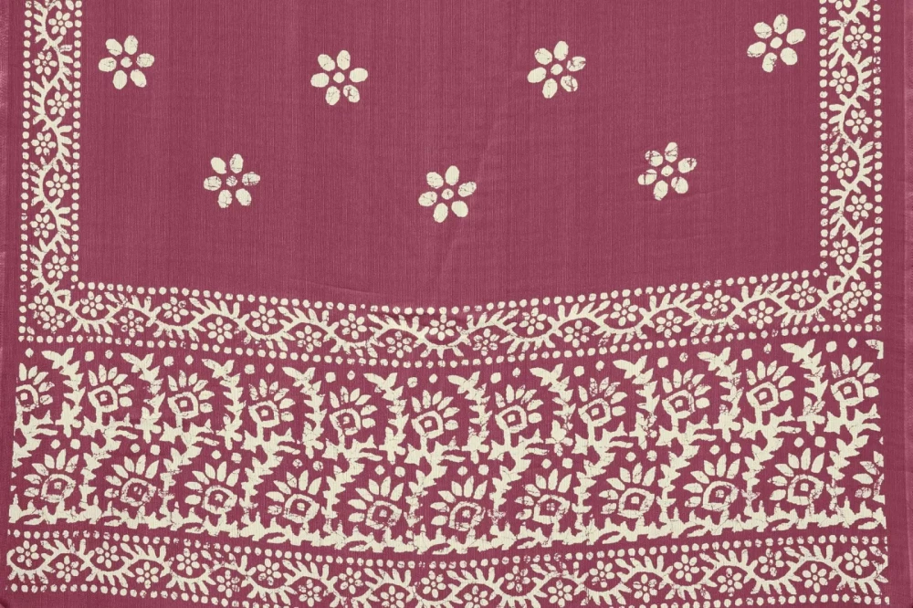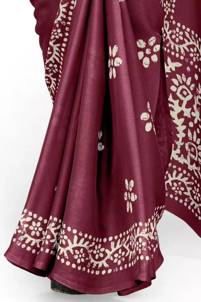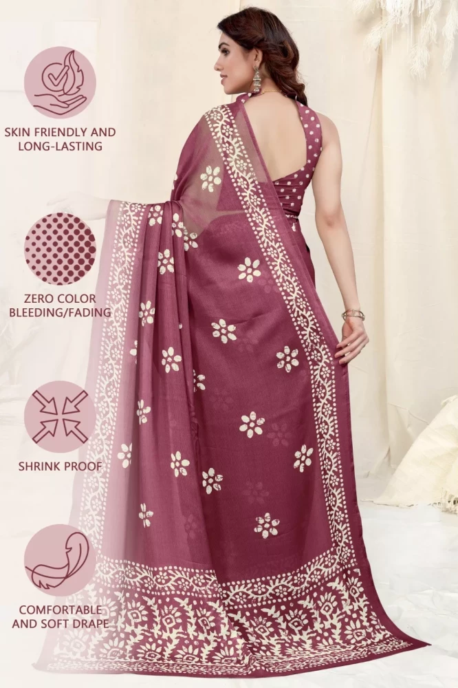 Add a touch of elegance and sophistication to your casual wardrobe with our Chiffon Batik Printed Wine Saree. Crafted from luxurious chinon shiffon fabric and adorned with intricate batik prints, this saree exudes charm and versatility, making it a perfect choice for various occasions.