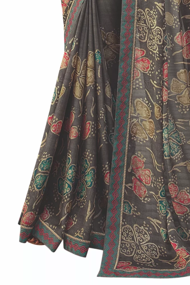 Elevating the timeless grey hue of the saree is an enchanting printed pattern, featuring intricate motifs and designs that add a touch of sophistication and allure. The mesmerizing artwork adds depth and dimension to the ensemble, making it a versatile choice for various occasions.