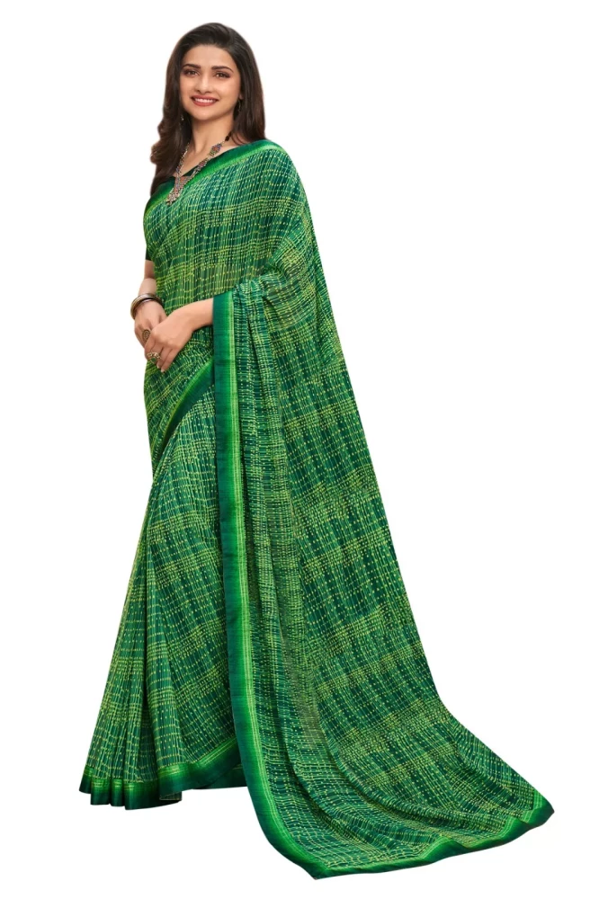 Adorned with an enchanting floral print in shades of green, this saree exudes a timeless elegance. The intricate floral motifs add a touch of femininity and grace, making it a perfect choice for both formal events and festive occasions.