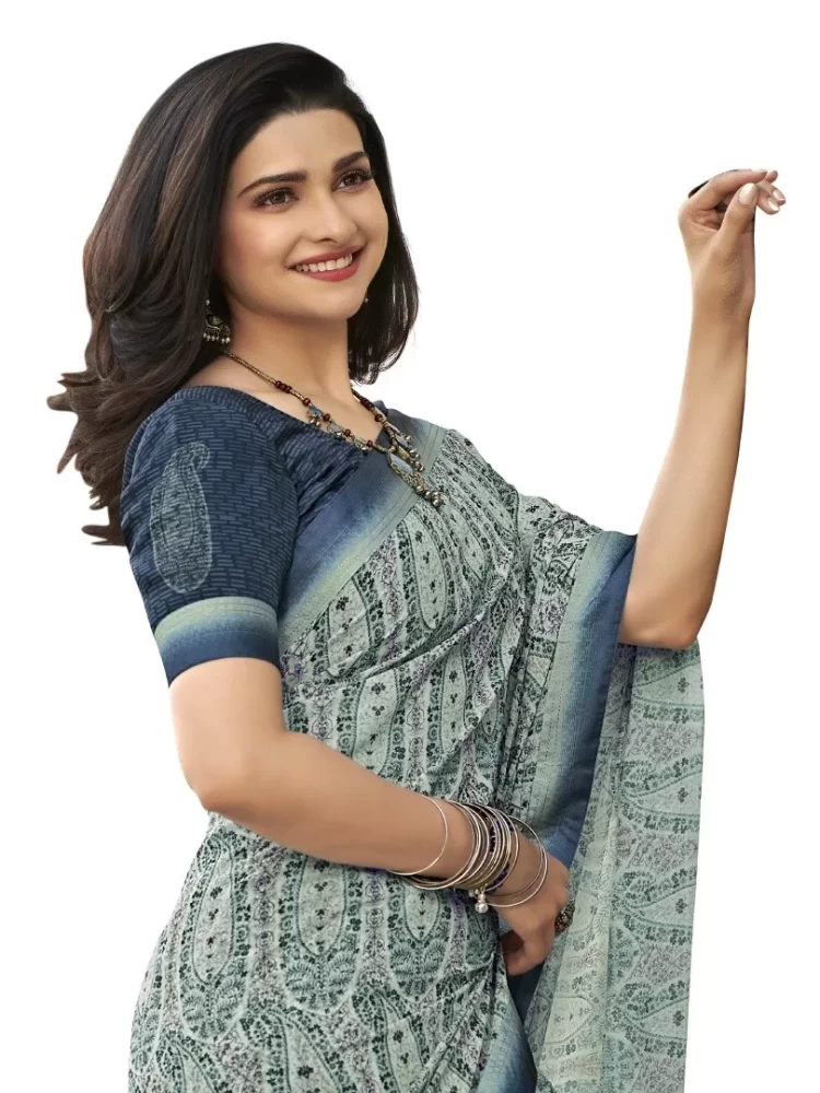 The saree features a stunning grey hue adorned with intricate prints that bring a modern twist to traditional saree designs. The delicate patterns enhance the overall appeal, making it perfect for a variety of occasions, from casual gatherings to festive celebrations.