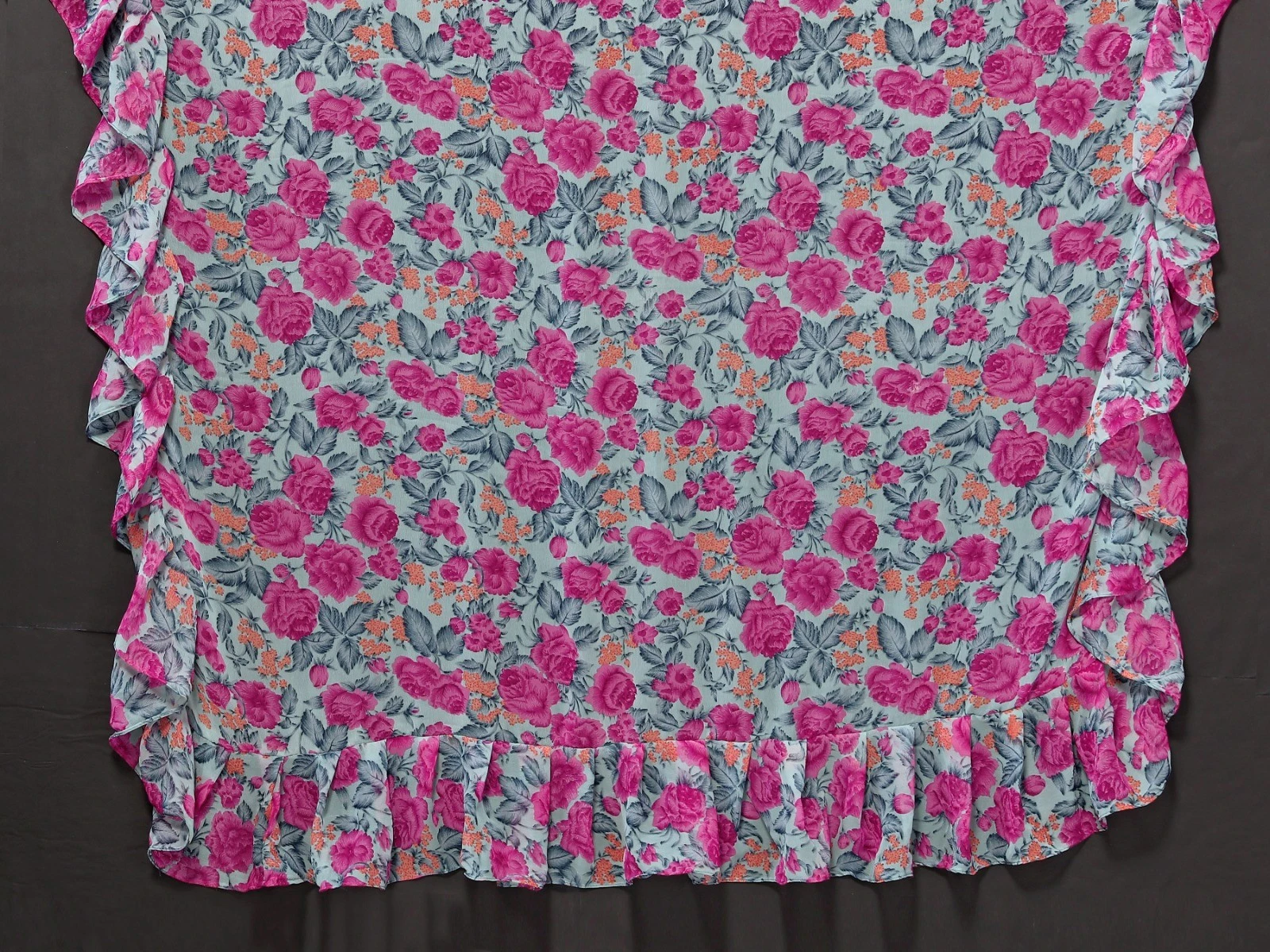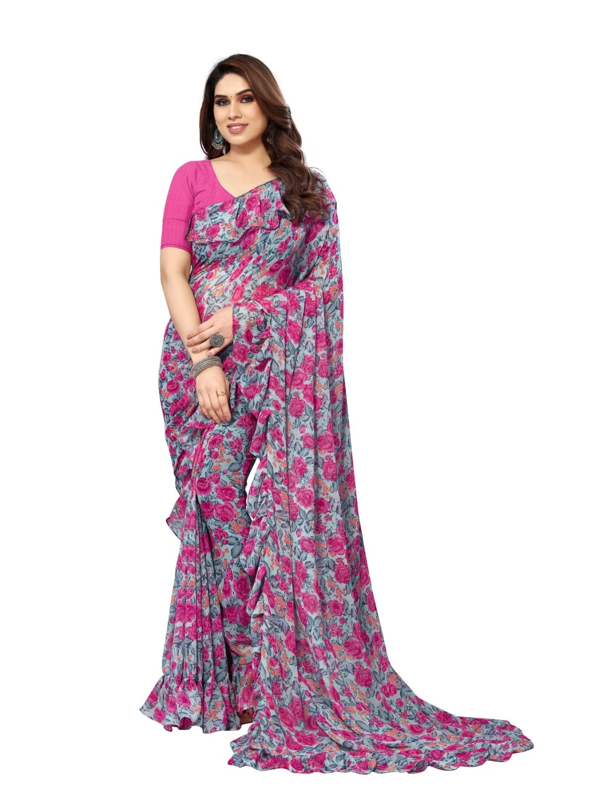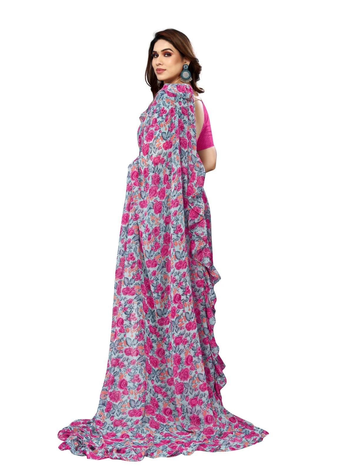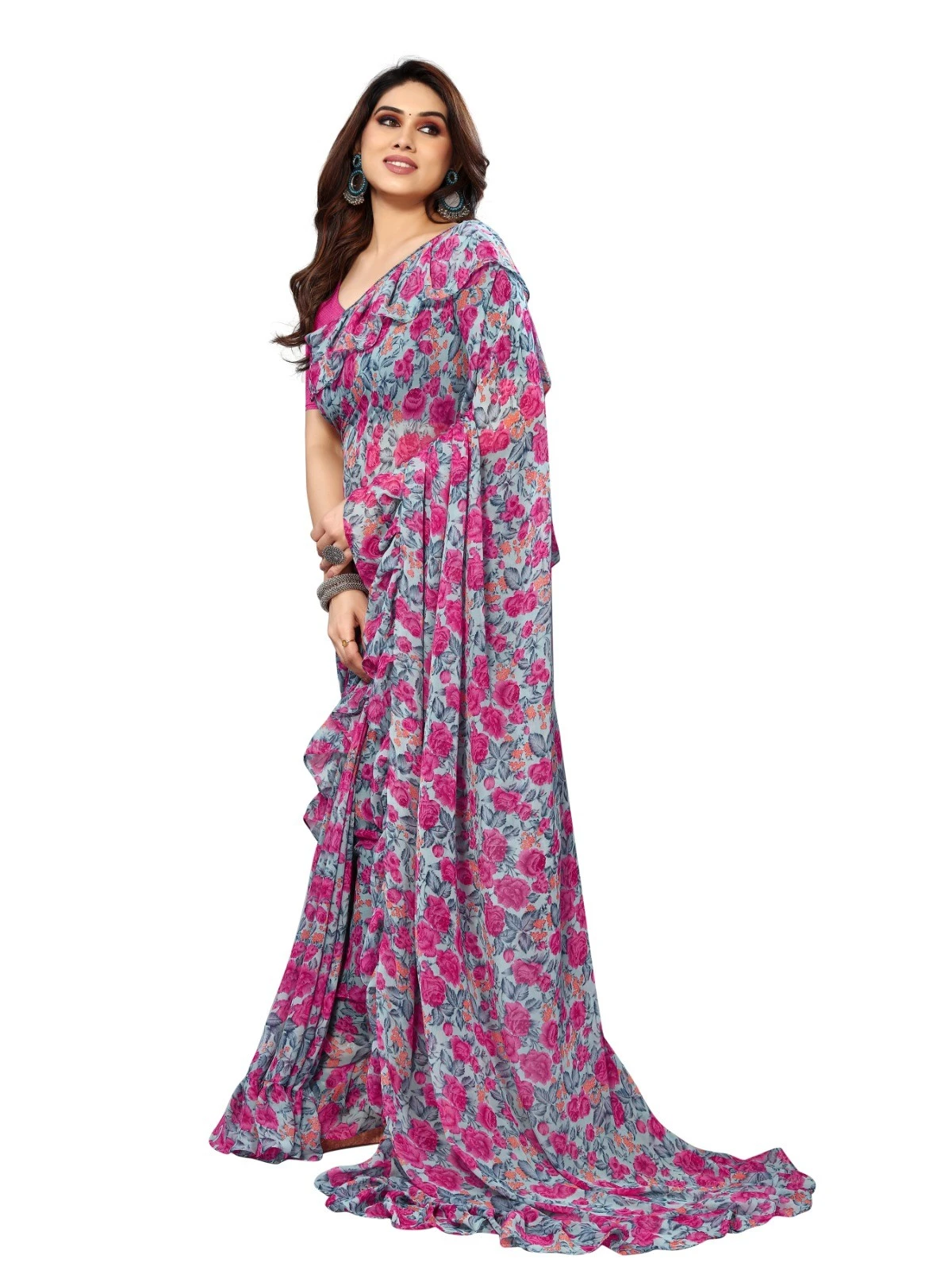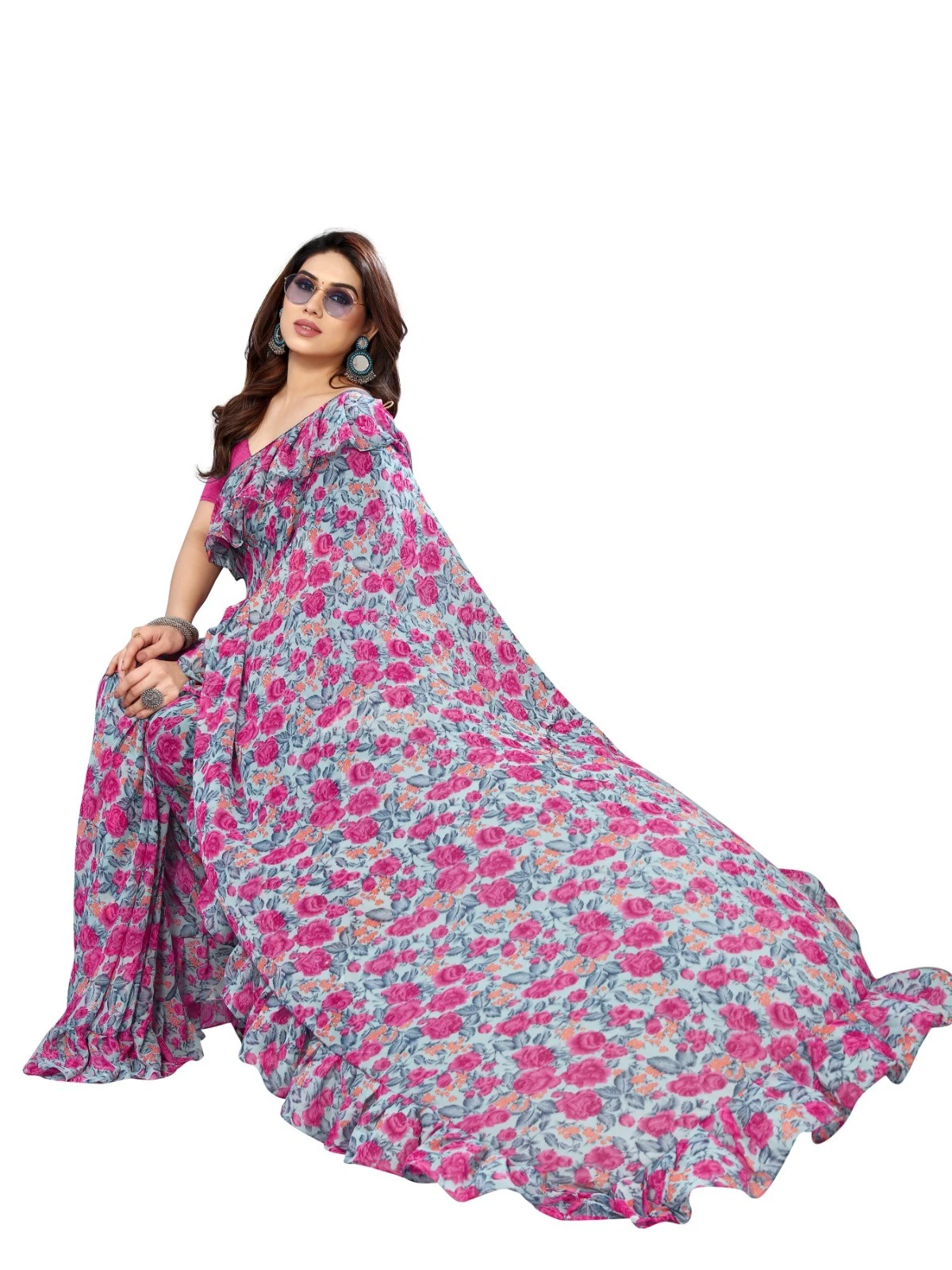 The saree showcases a contemporary Printed Ruffle design that adds a playful twist to the traditional drape. The cascading ruffles create a dynamic and eye-catching silhouette, while the printed motifs infuse the saree with artistic flair and visual interest. The intricate patterns and designs reflect meticulous craftsmanship, elevating the saree's overall allure.