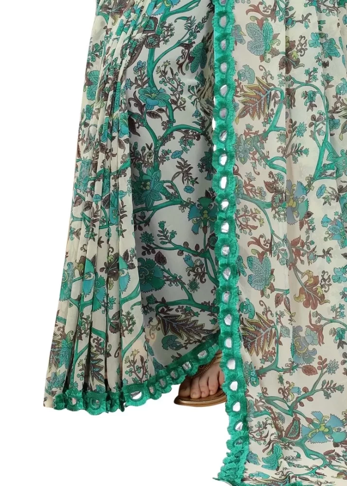 The saree is designed without mirror work, allowing the beautiful prints to take center stage. This subtle approach creates a refined and sophisticated look, perfect for those who prefer understated elegance. The absence of mirrors also ensures a lighter and more comfortable wear, making it ideal for extended occasions.