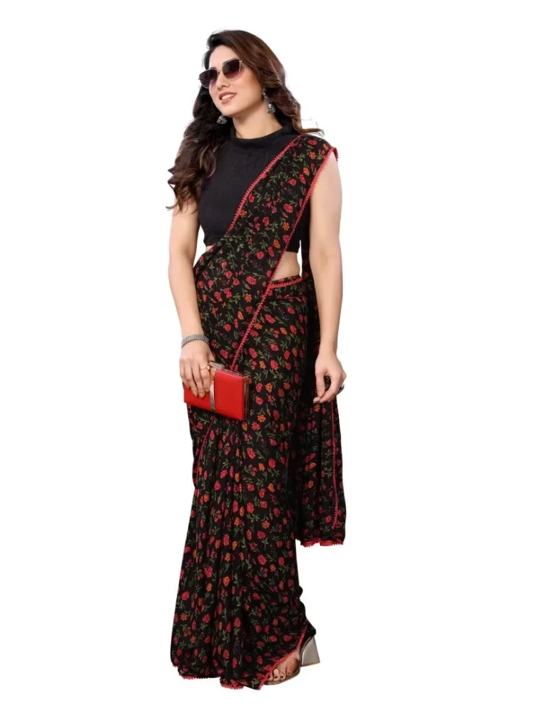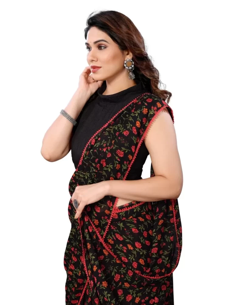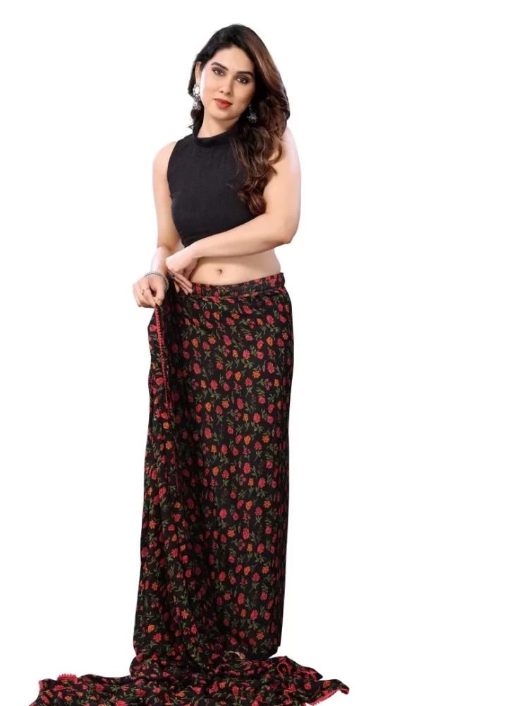 This saree features a classic black hue adorned with intricate printed patterns, adding a touch of sophistication and charm to your wardrobe. The ready-to-wear design ensures a flawless drape effortlessly, allowing you to achieve a polished and stylish look in no time.