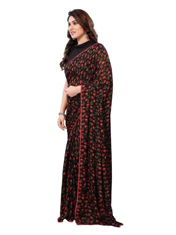Crafted from high-quality fabric, this saree offers both comfort and durability, making it ideal for various occasions. The timeless black color combined with the detailed prints makes this saree perfect for formal gatherings, festive celebrations, and casual events. Its lightweight and breathable nature ensures you stay comfortable throughout the day.