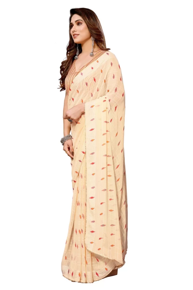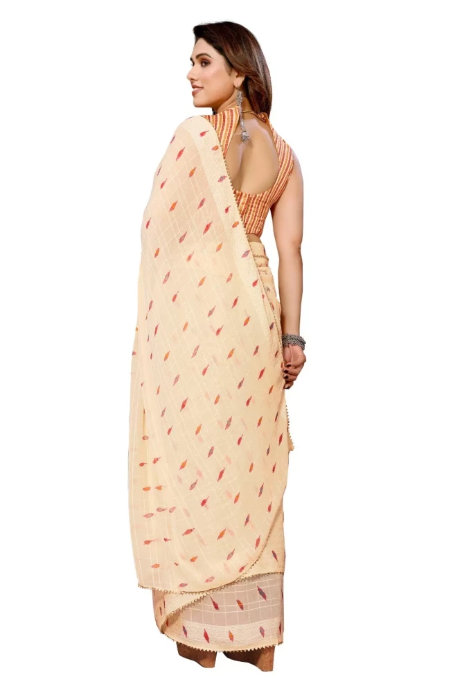 The saree is crafted from high-quality georgette checks fabric, known for its lightweight texture and elegant drape. The intricate checks pattern adds a touch of sophistication to the ensemble, enhancing its visual appeal and creating a captivating effect. The fabric drapes gracefully around the body, ensuring comfort and ease of movement.
