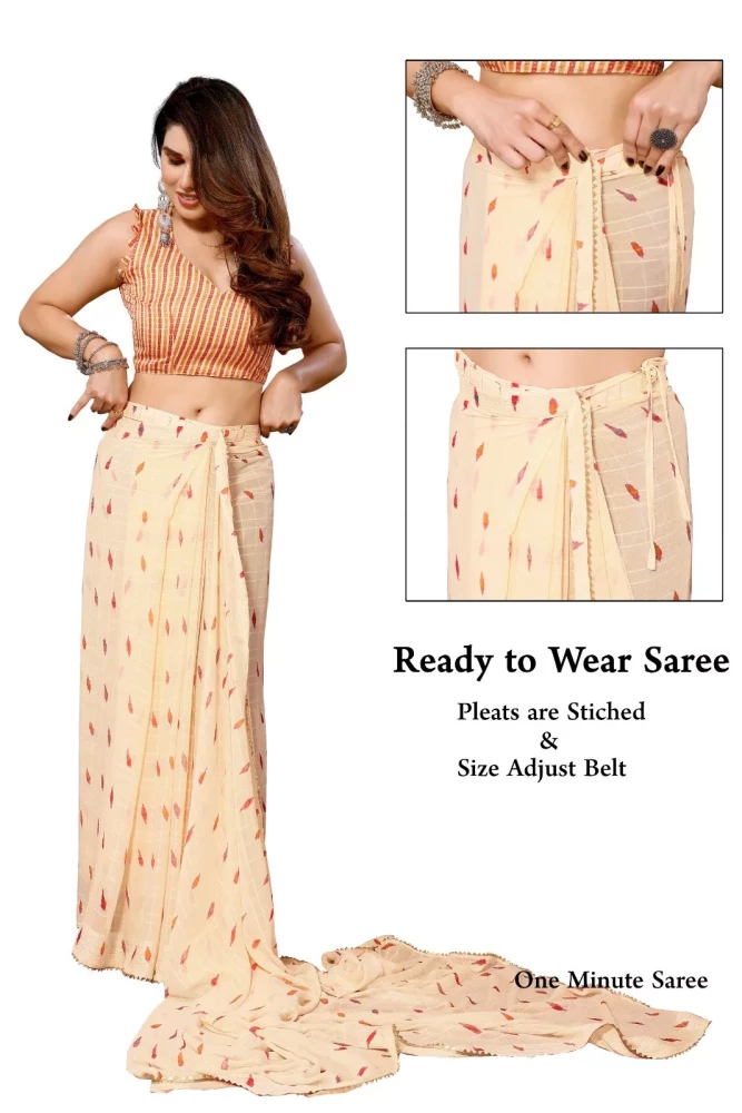 Featuring a readymade pleated design, this saree eliminates the hassle of pleating and draping, allowing you to effortlessly slip into elegance within minutes. The pleats are meticulously stitched for a perfect fit, ensuring a flattering silhouette and effortless style. Simply wrap the saree around yourself and secure it in place for a polished and poised look.