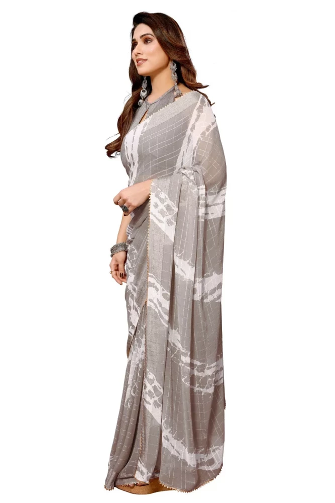 Made from premium georgette checks fabric, this saree exudes a luxurious appeal with its soft texture and graceful drape. The intricate checks pattern adds depth and dimension to the saree, creating a mesmerizing visual effect that is sure to turn heads. The lightweight fabric ensures comfort and ease of movement, allowing you to exude confidence and elegance with every step.