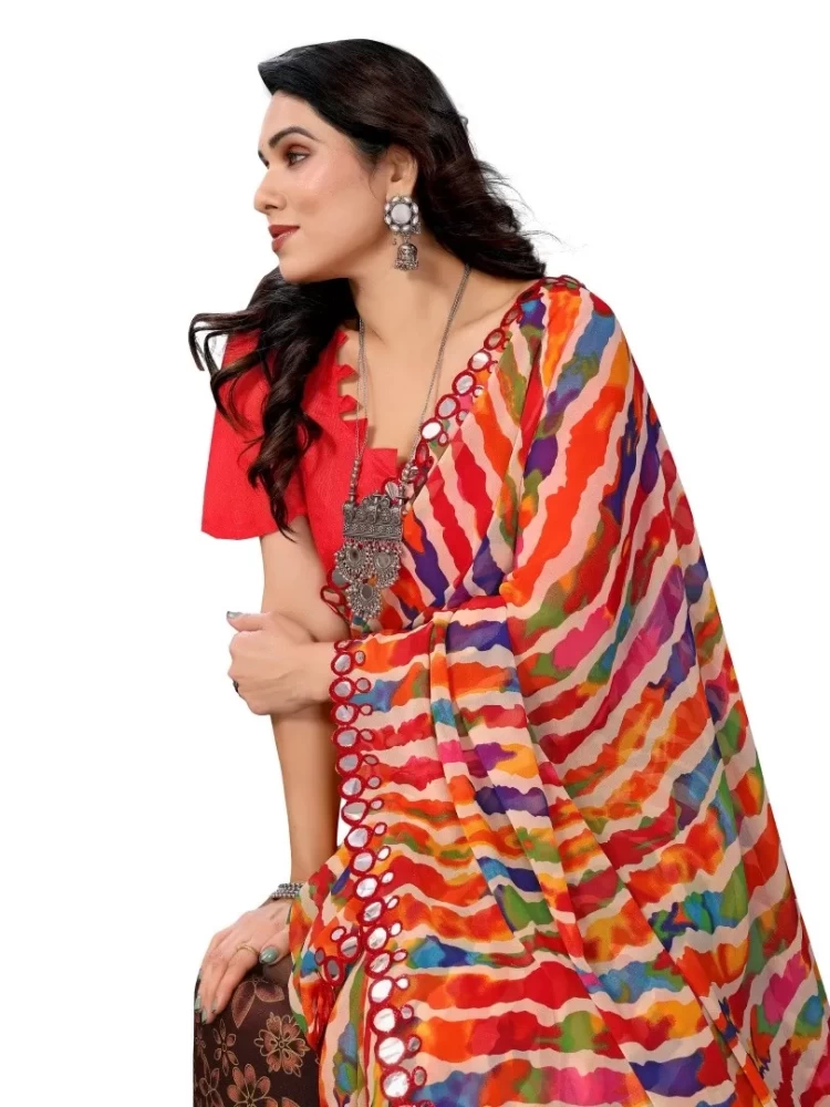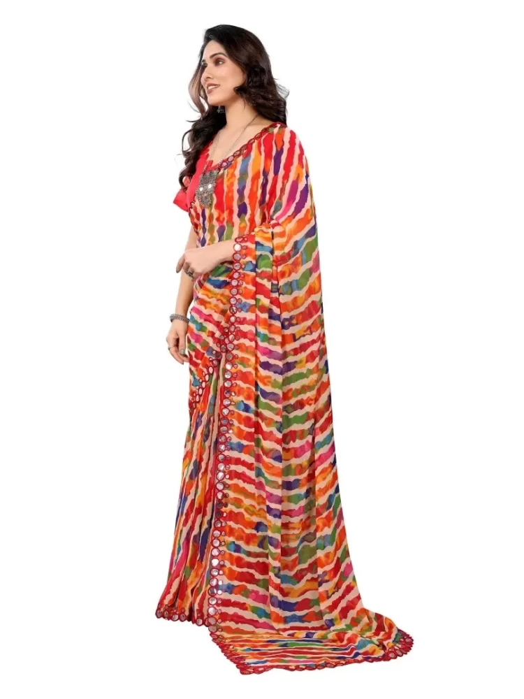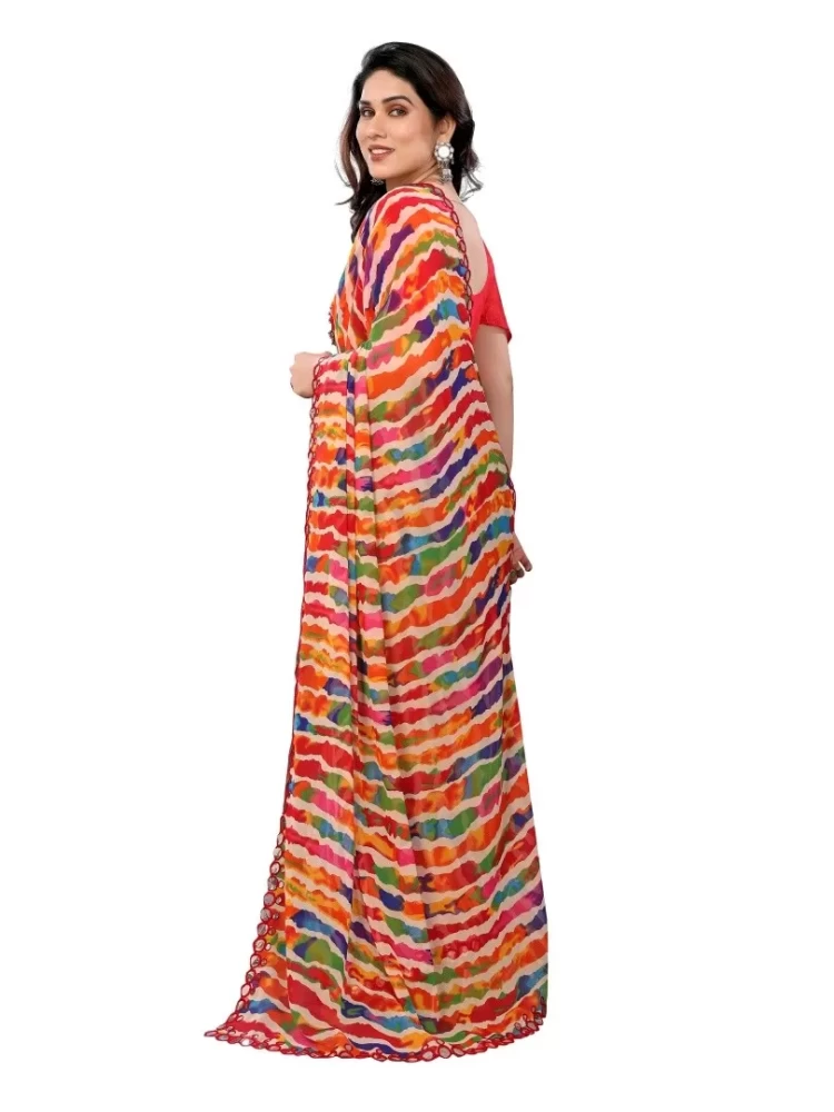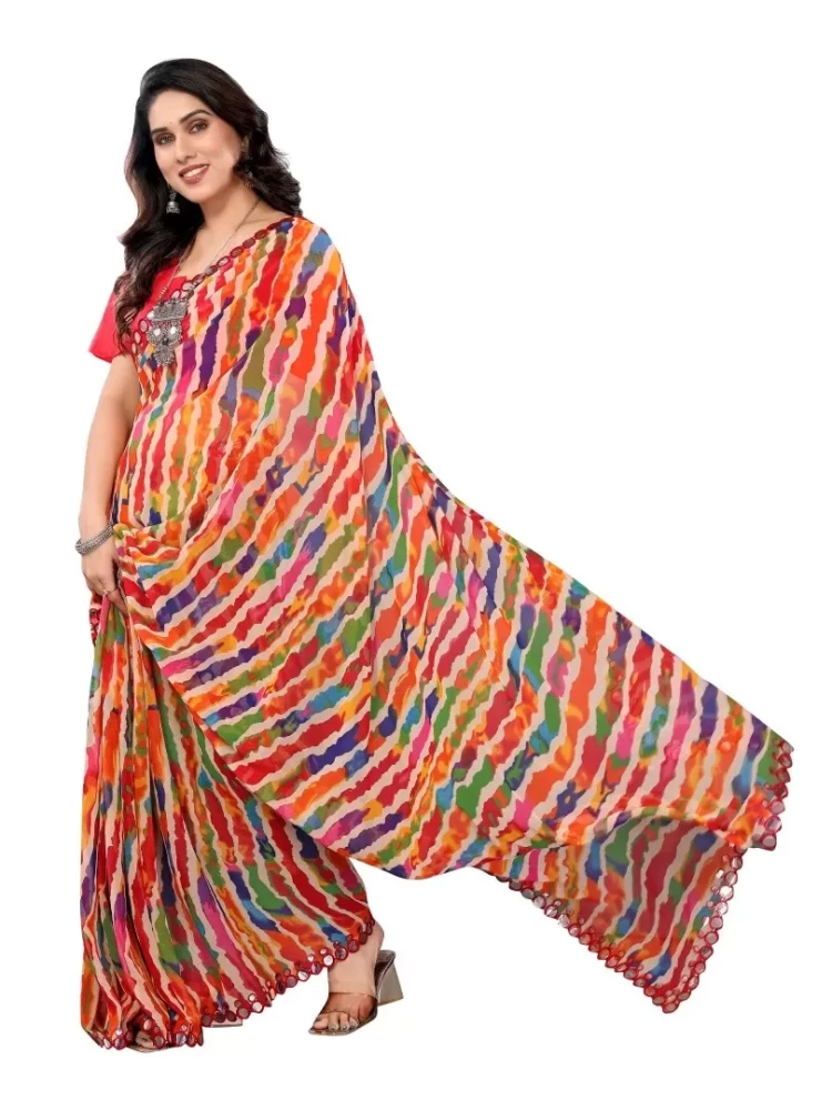 • Premium Georgette Fabric: The saree is crafted from high-quality georgette, known for its lightweight, sheer texture, and fluid drape, offering a comfortable and elegant wear.