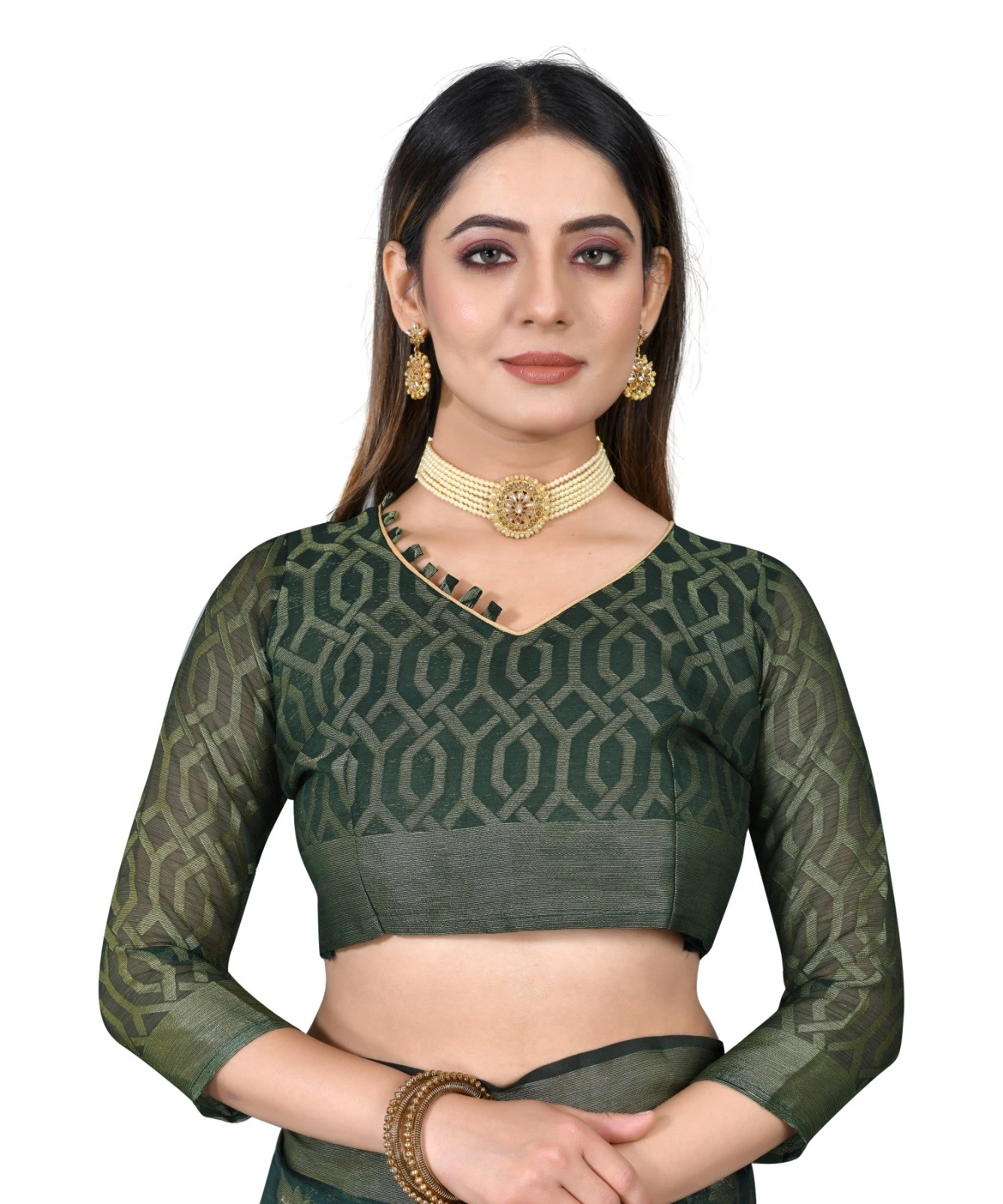 Draped in a timeless Green hue, this saree exudes sophistication and panache. Green is a versatile shade that complements various skin tones and is suitable for a myriad of occasions, be it formal events, festive gatherings, or intimate celebrations.