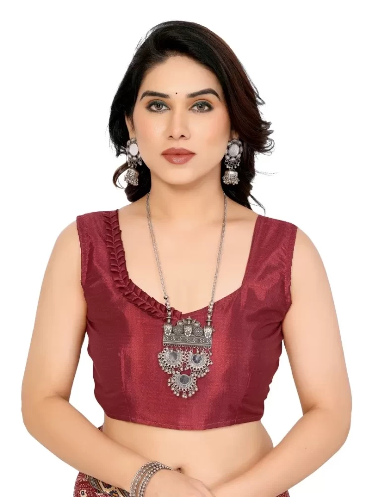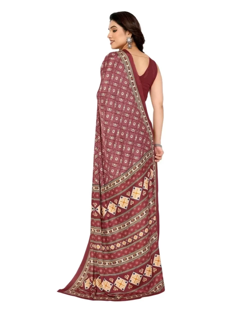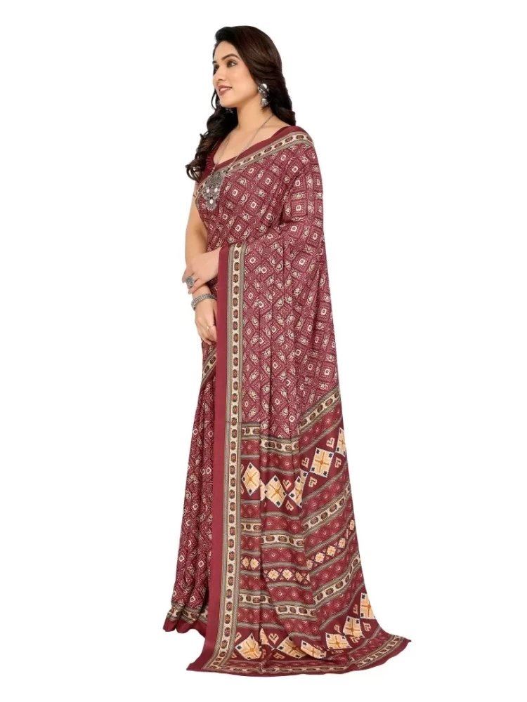 This saree features a rich maroon color adorned with intricate prints, exuding a blend of traditional and contemporary charm. Made from luxurious silk crepe fabric, it offers a smooth and graceful drape, ensuring you stay comfortable and stylish.