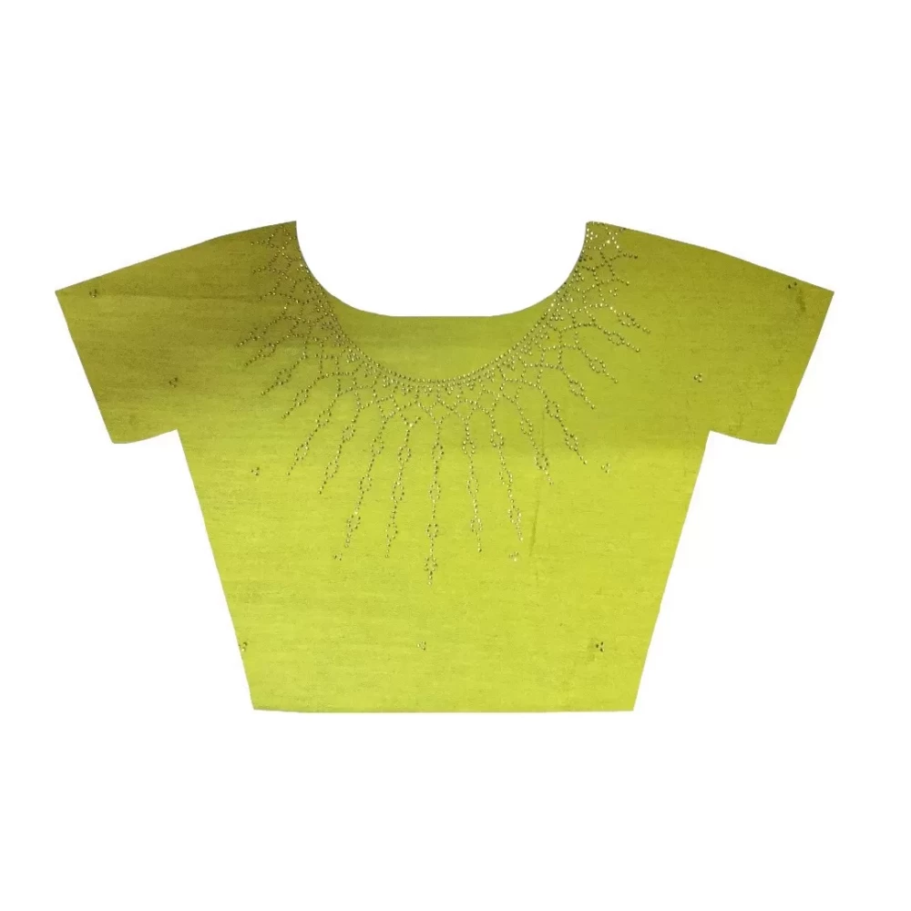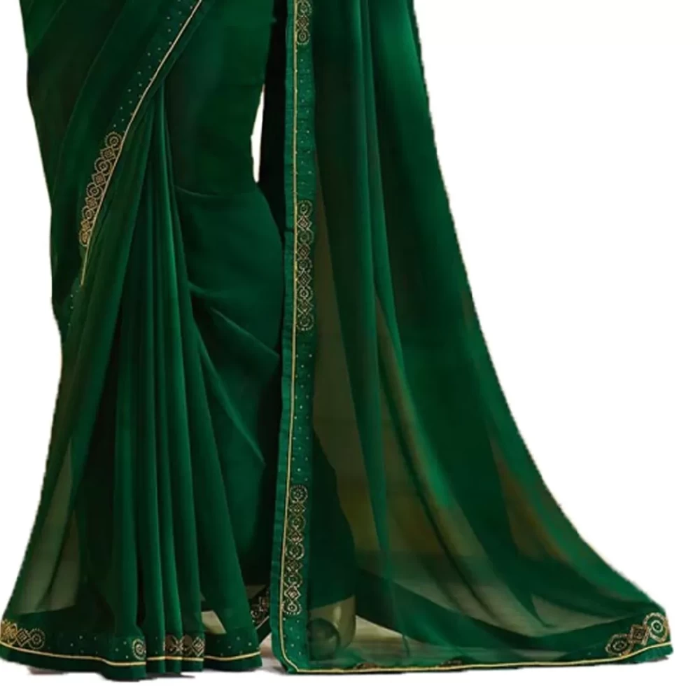 This exquisite saree is crafted from high-quality georgette fabric, known for its lightweight and flowing drape, ensuring both comfort and elegance. The rich green hue of the saree is beautifully complemented by intricate stone work, adding a touch of sparkle and sophistication to your ensemble.