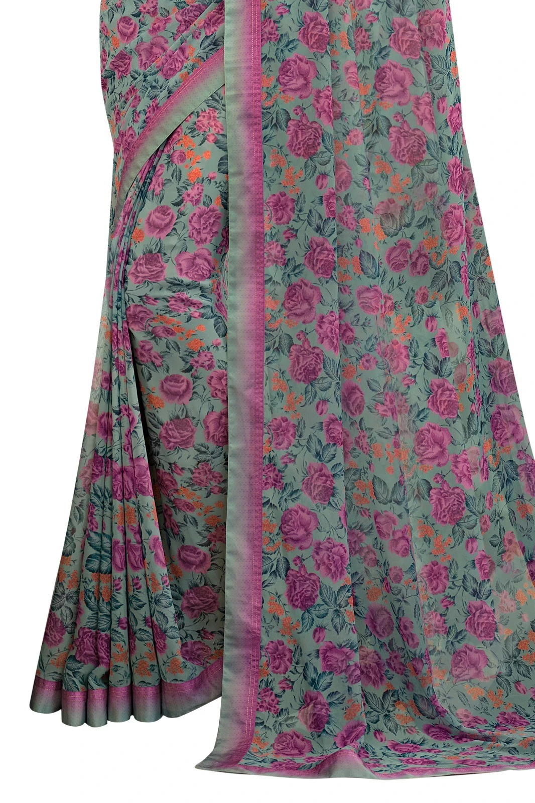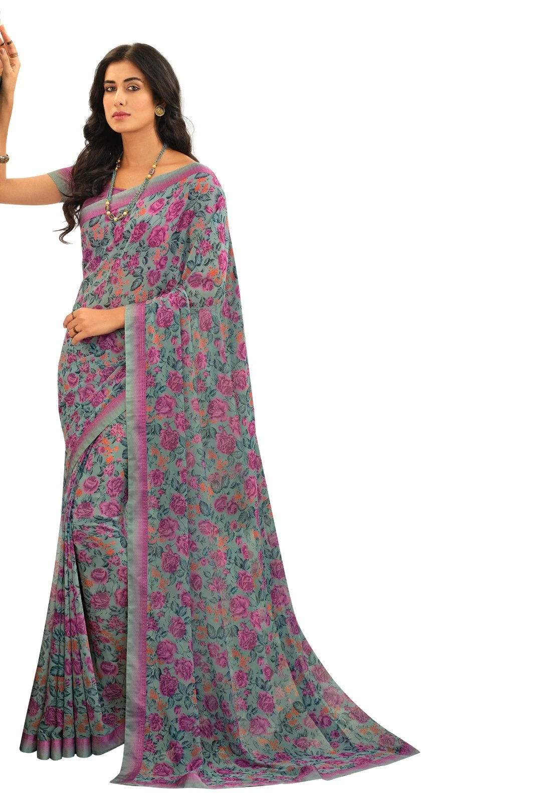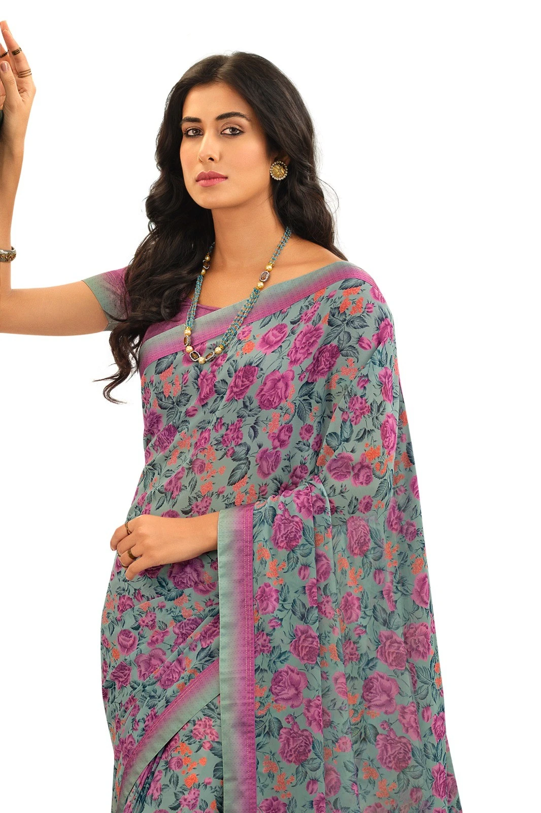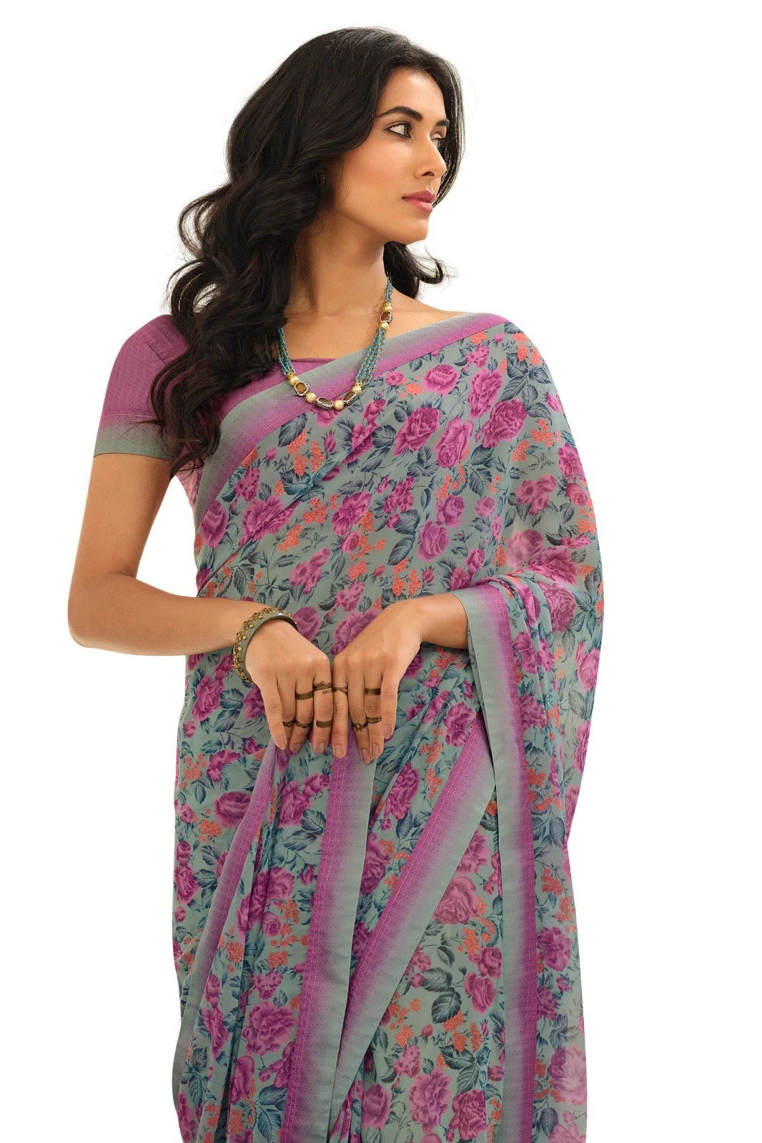 Pattern: Adorned with a chic and trendy print, this saree exudes modernity and style. The intricate patterns and motifs are artfully printed on the Grey Georgette fabric, creating a striking contrast and visual interest. The contemporary print adds a touch of flair to the traditional silhouette, making it perfect for fashion-forward individuals looking to make a statement.