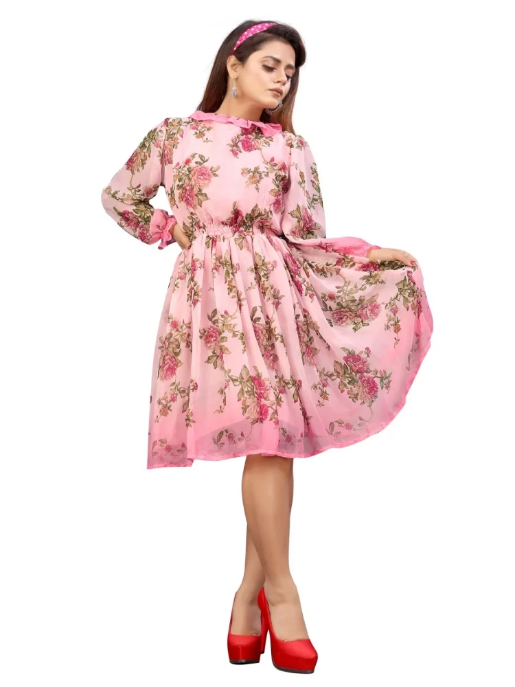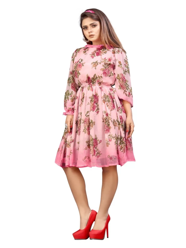 Indulge in effortless style with our Women's Georgette Printed Pink Knee Length Dress, a must-have addition to your collection that promises to keep you looking chic and fashionable wherever you go.