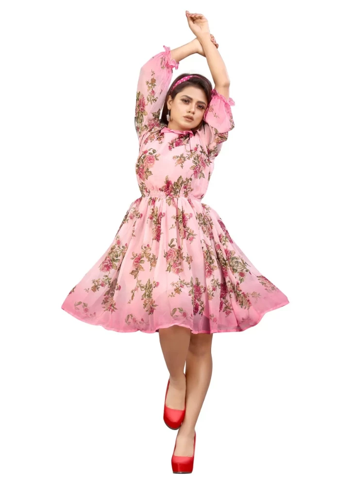 Introducing our Womens Georgette Printed Pink Knee Length Dress, a delightful combination of elegance and charm that will effortlessly elevate your ensemble. Crafted from premium Georgette fabric, this dress offers both luxurious comfort and exquisite style.