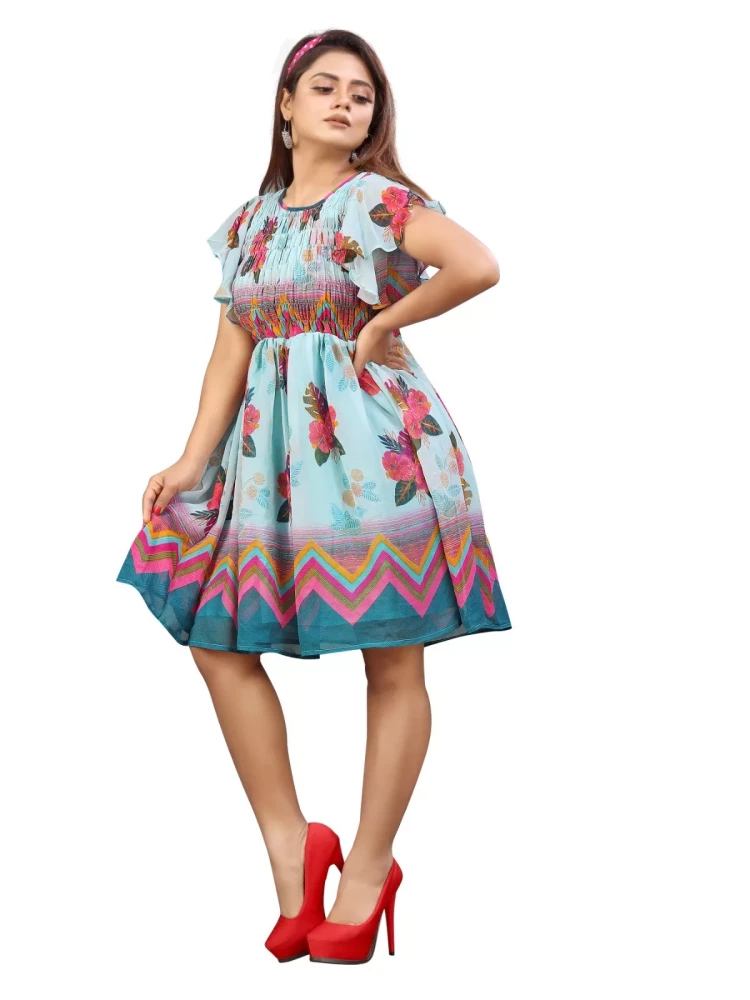 Embrace effortless style and grace with our Women's Georgette Printed Sky Knee Length Dress, a wardrobe staple that promises to keep you looking and feeling fabulous on any occasion.