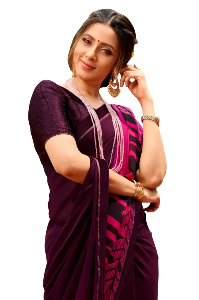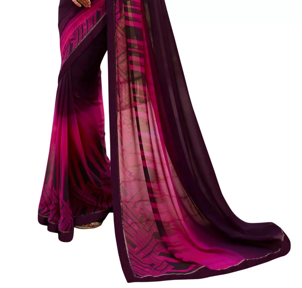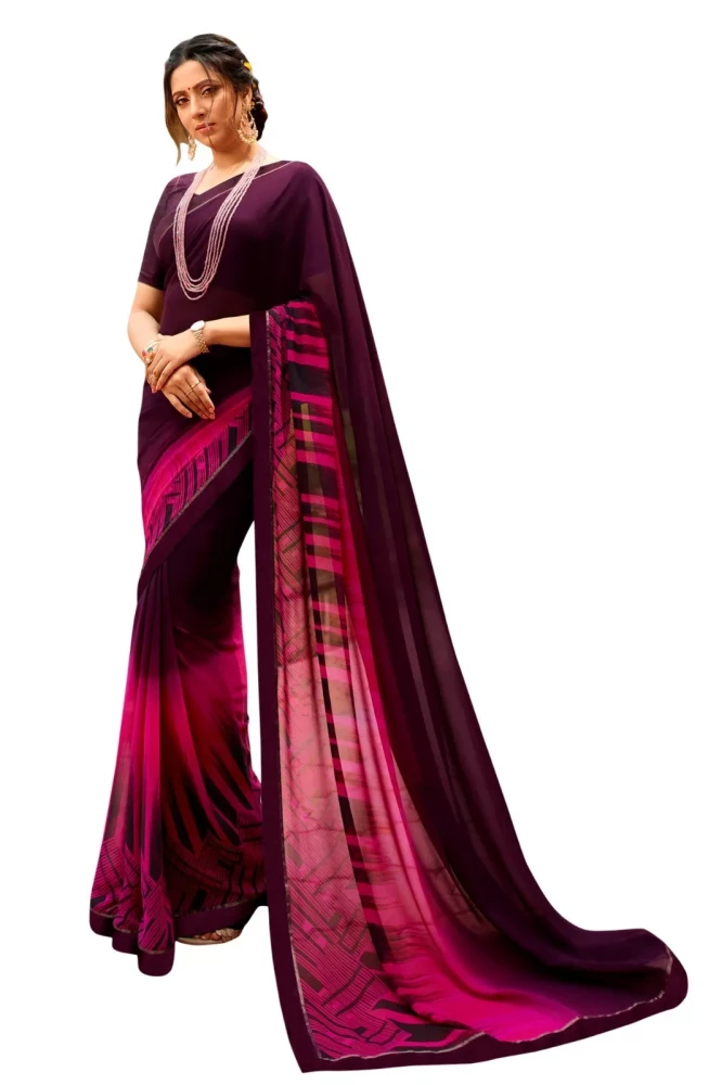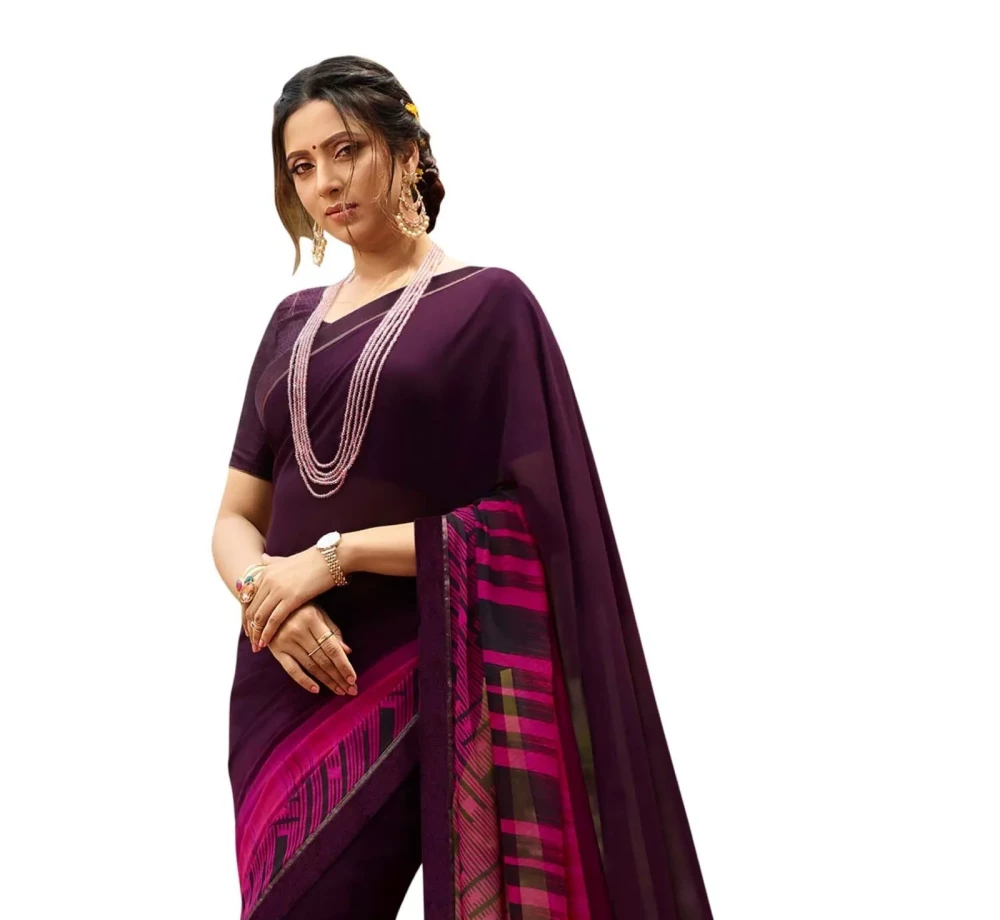 Crafted from premium georgette fabric, the saree drapes gracefully and exudes sophistication. The rich purple hue adds a touch of regal charm and elegance to your look, making you stand out with poise and grace. The lightweight and breathable fabric ensure comfort throughout the day, allowing you to move with ease and confidence.