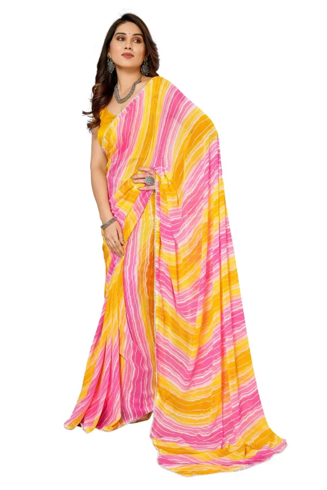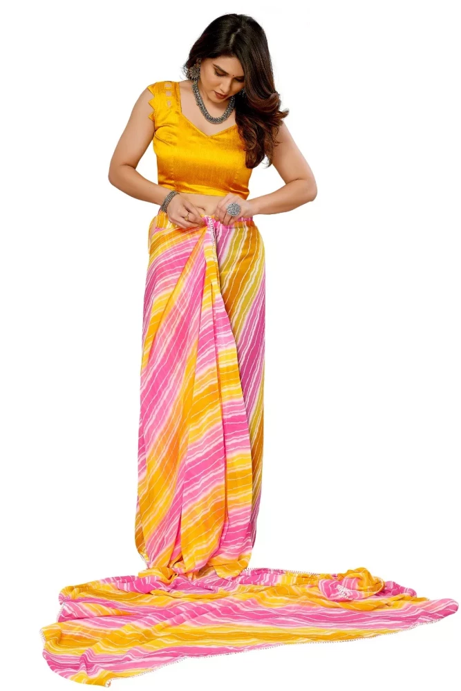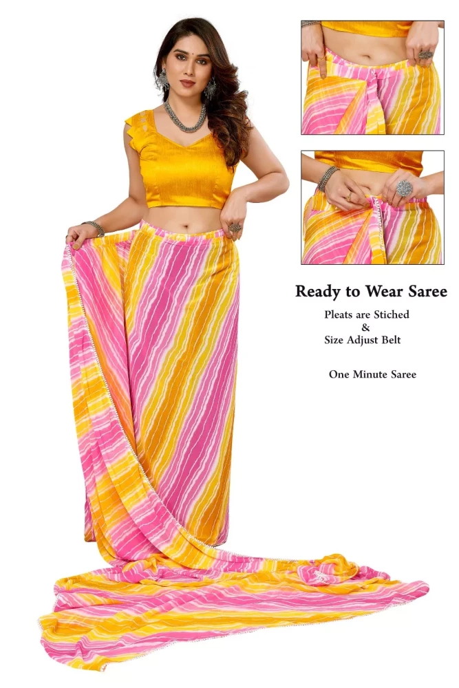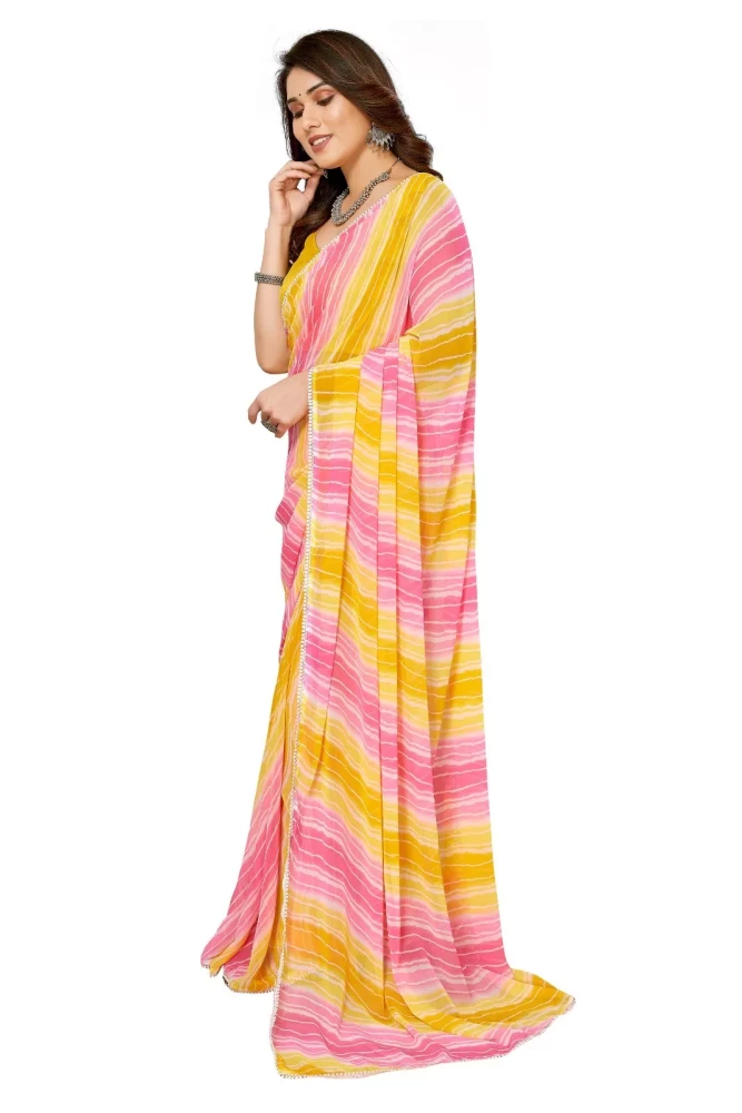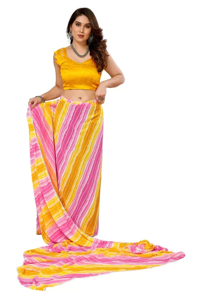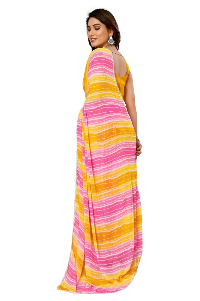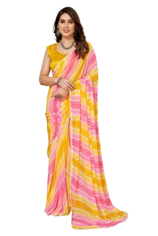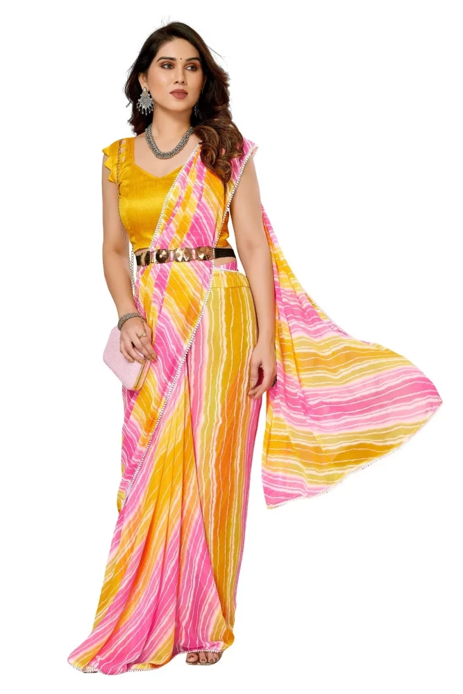Women Redy to Wear Printed Yellow and Pink Saree With Small Lace Border Blouse