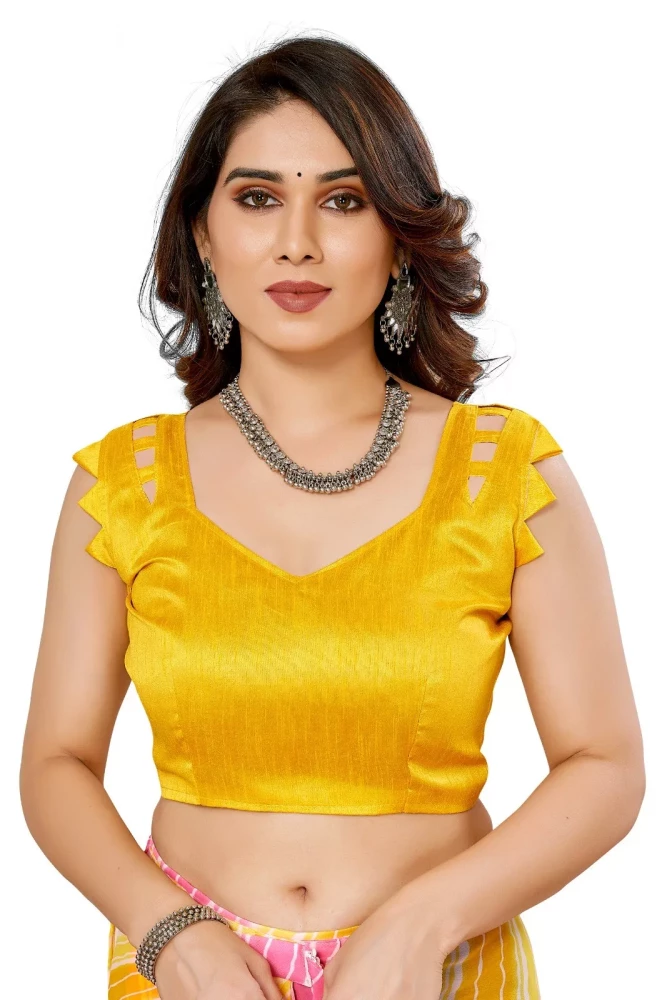 The saree, made from luxurious Georgette fabric, drapes gracefully over 5.5 meters, showcasing a captivating printed pattern in delightful shades of yellow and pink. The combination of colors adds a cheerful and lively touch, perfect for celebrating special occasions with style.