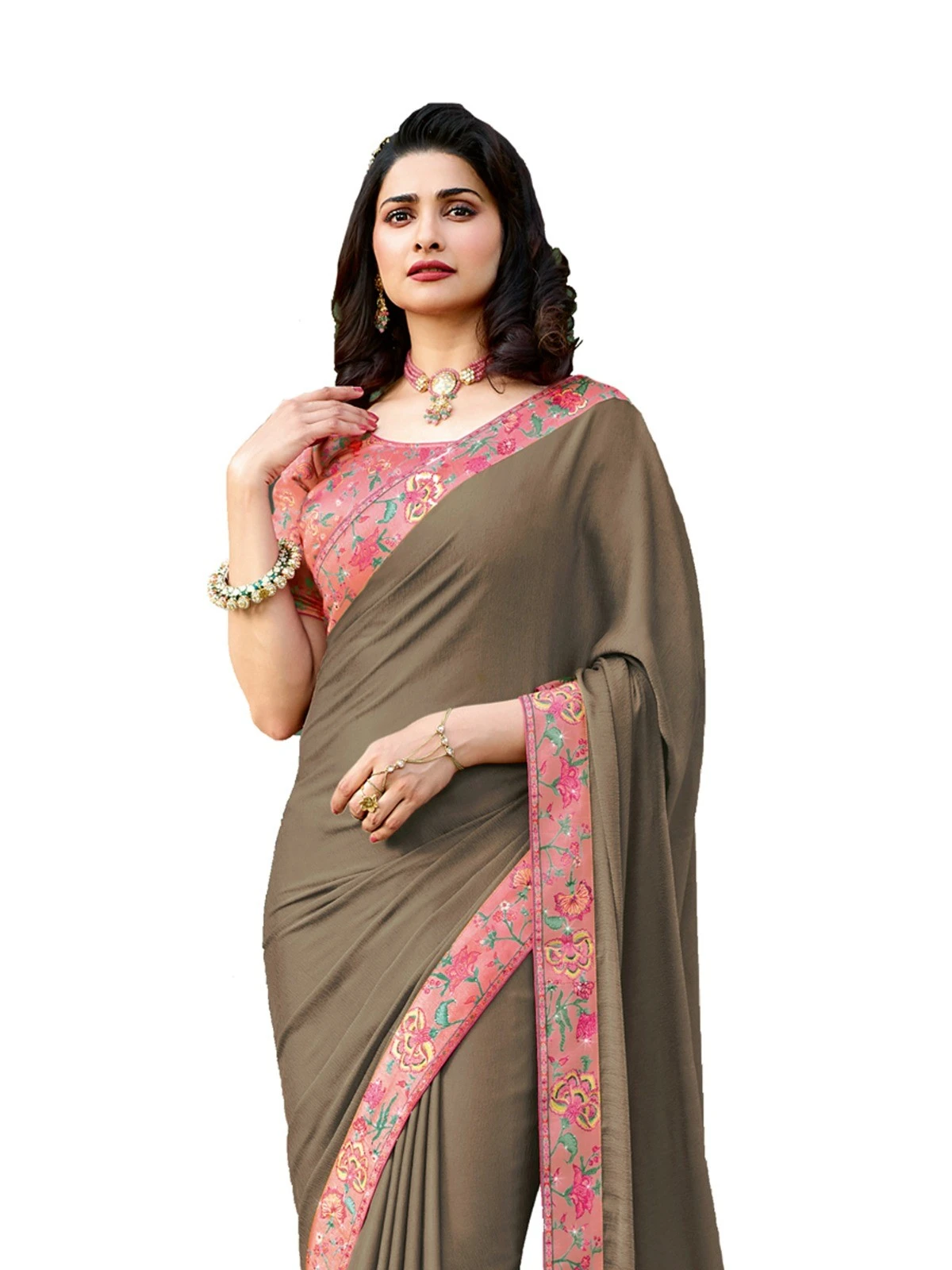 Fabric: Crafted from premium SANGINI fabric, this saree epitomizes luxury and sophistication. The SANGINI fabric offers a smooth and lustrous texture, ensuring comfort and grace with every drape. Its lightweight nature makes it perfect for long hours of wear, while its rich Grey hue adds a touch of glamour to your ensemble.