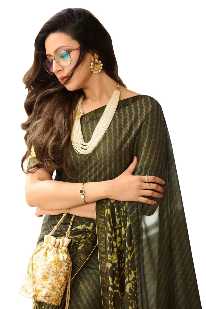Whether adorned with statement jewelry and elegant accessories for a glamorous look or kept understated with minimal adornments for a more refined appearance, our Women's Foil Print Lace Border Work Mahindi Sari With Banglory Blouse promises to elevate your ethnic ensemble with timeless elegance and impeccable style.