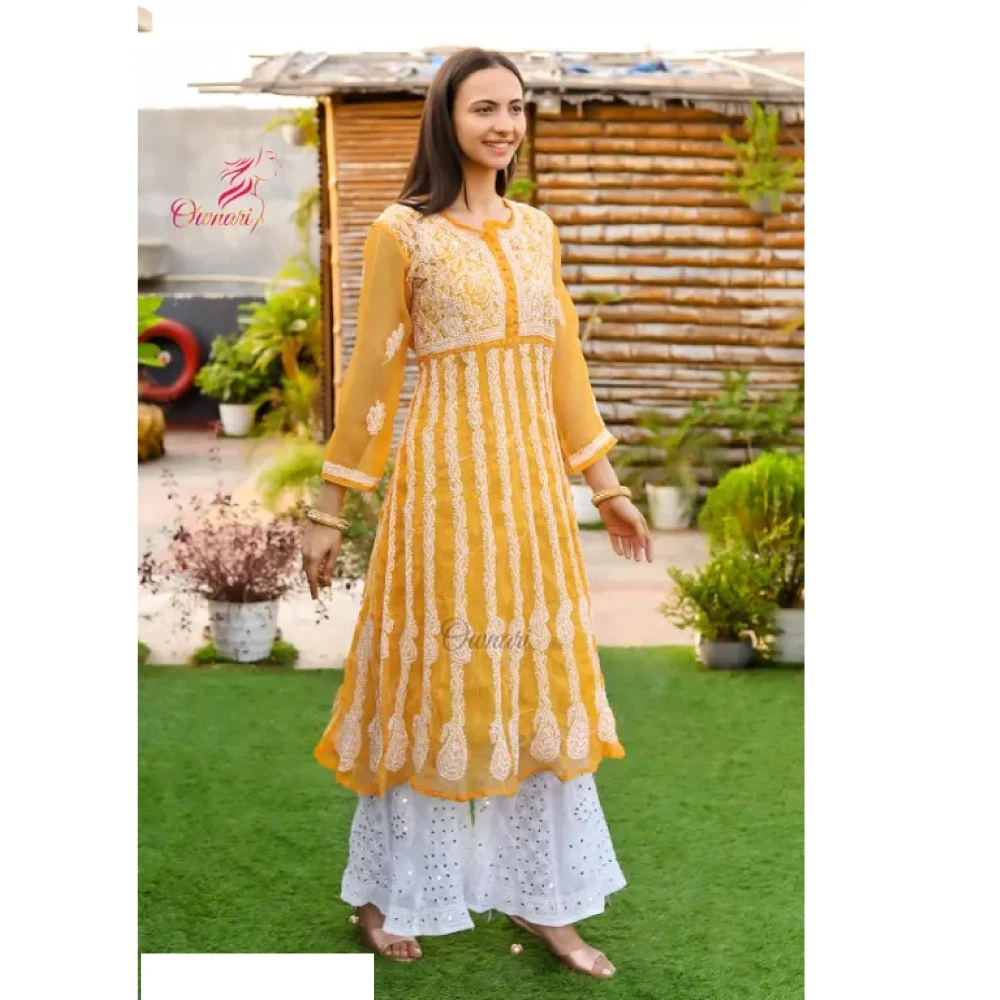 Ownari Yog Anarkali Chikankari Kurti With Inner Yellow
