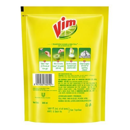 Vim Gel dishwashing liquid comes infused with the Power of lemons Just 1 spoon of Vim Gel is all you need to remove the toughest of grease from your utensils. Its special formula ensures that it is tough on stains but gentle on your hands. Just one teaspoon of Vim Gel in one cup of water and you're ready Its ensures that the toughest of grease is removed with ease without damaging your precious cookware. So whether it is mums burnt Halwa or your experimental Dal Makhani, sparkling clean utensils is something you will get every time. Vim gel, unlike the other Dishwash bars, does not leave a white residue which is visible after the utensils have dried and do not damage or scratch your expensive cookwares delicate surfaces such as non-stick or ceramic too. Vim Gel with its power of lemons comes with a refreshing lemon fragrance which not only helps to do away with odour but also gives the best grease-cutting ability makes it our best dishwashing product ever. Dont forget its gentle on your hands too Vim gel is also available in various bottles and pouches with nozzles making it easy to pour. So go ahead, give it a try