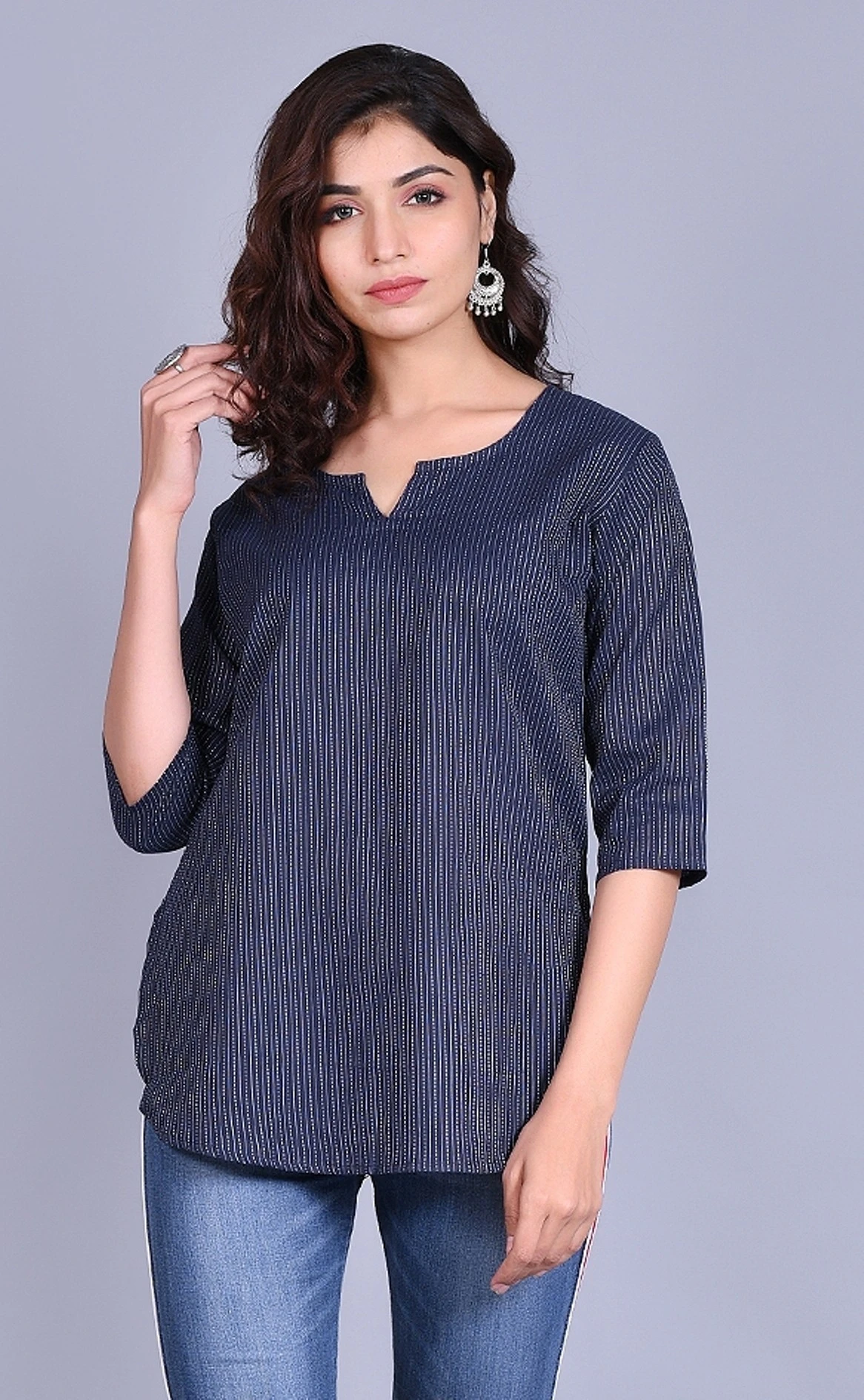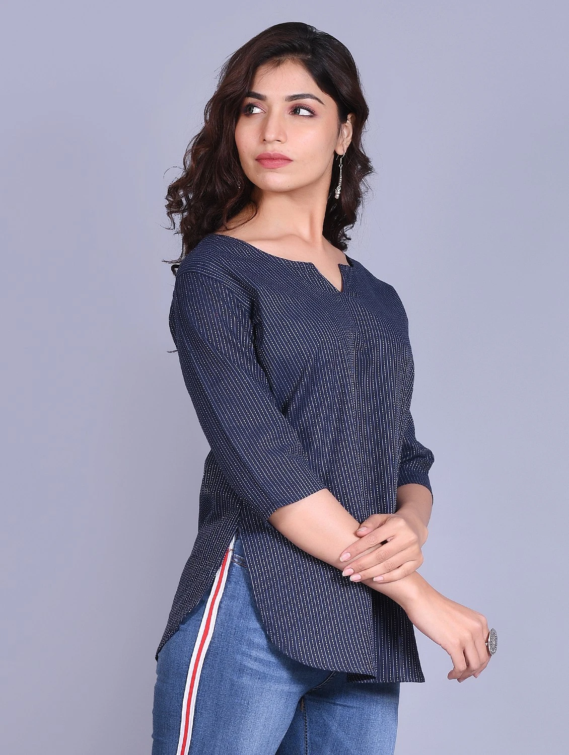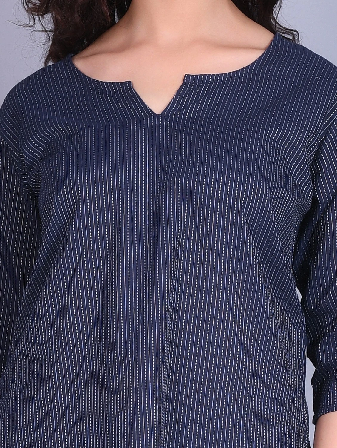 This product is a navy blue cotton blend kurta from the renowned Pink City Style. This kurta is made with care and features a beautiful pattern and a striking print that make it a stunning choice for modern women who want to impress. The regular fit flatters your figure, and the smooth cotton keeps you cozy all day long.