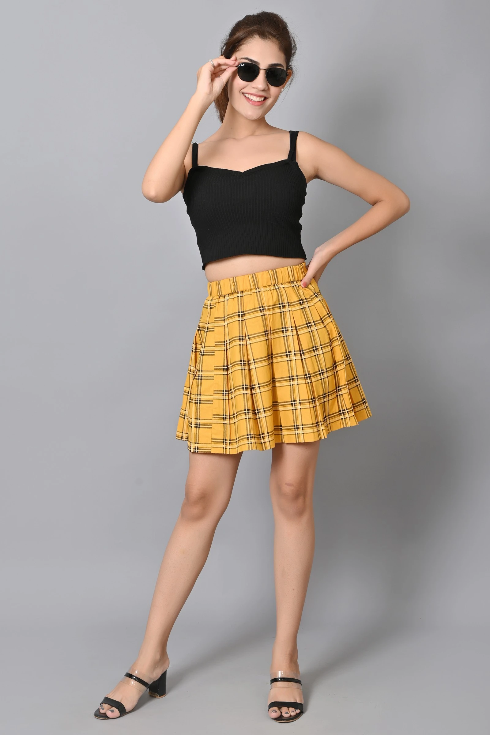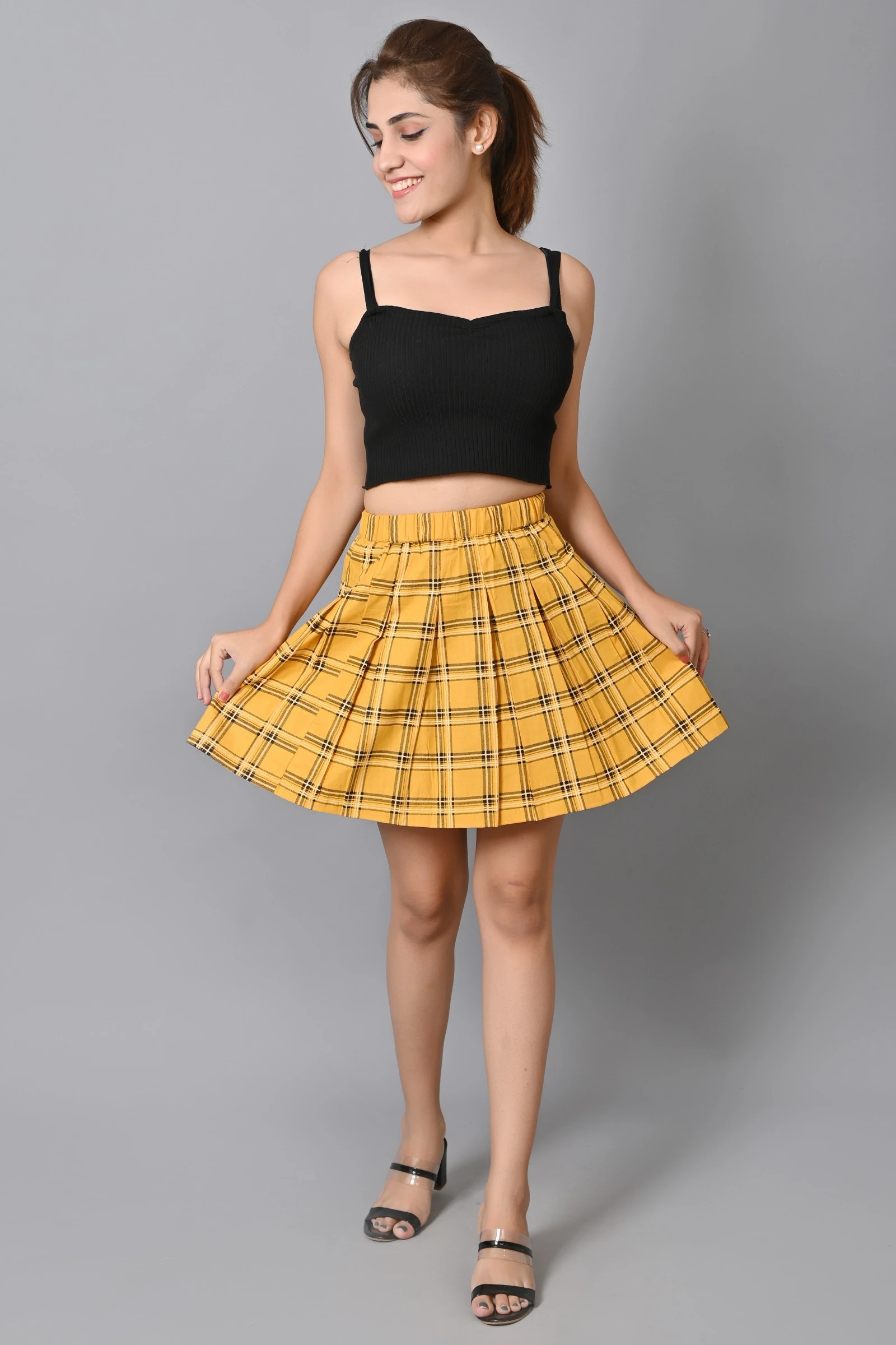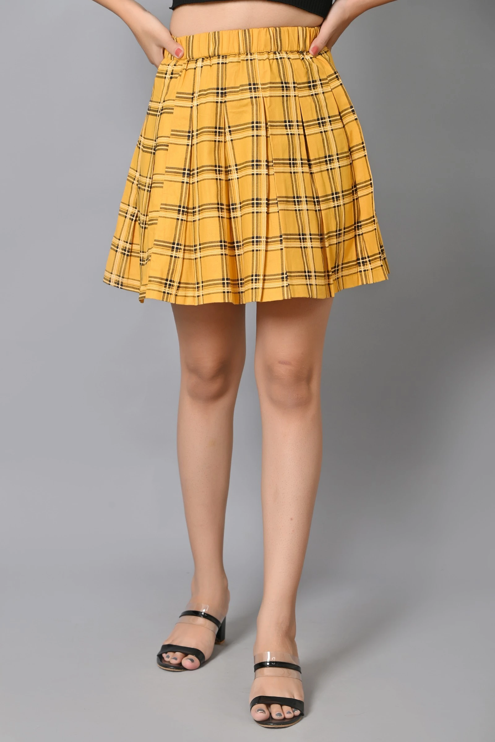 Women Checkered Pleated Mustard Yellow Skirt