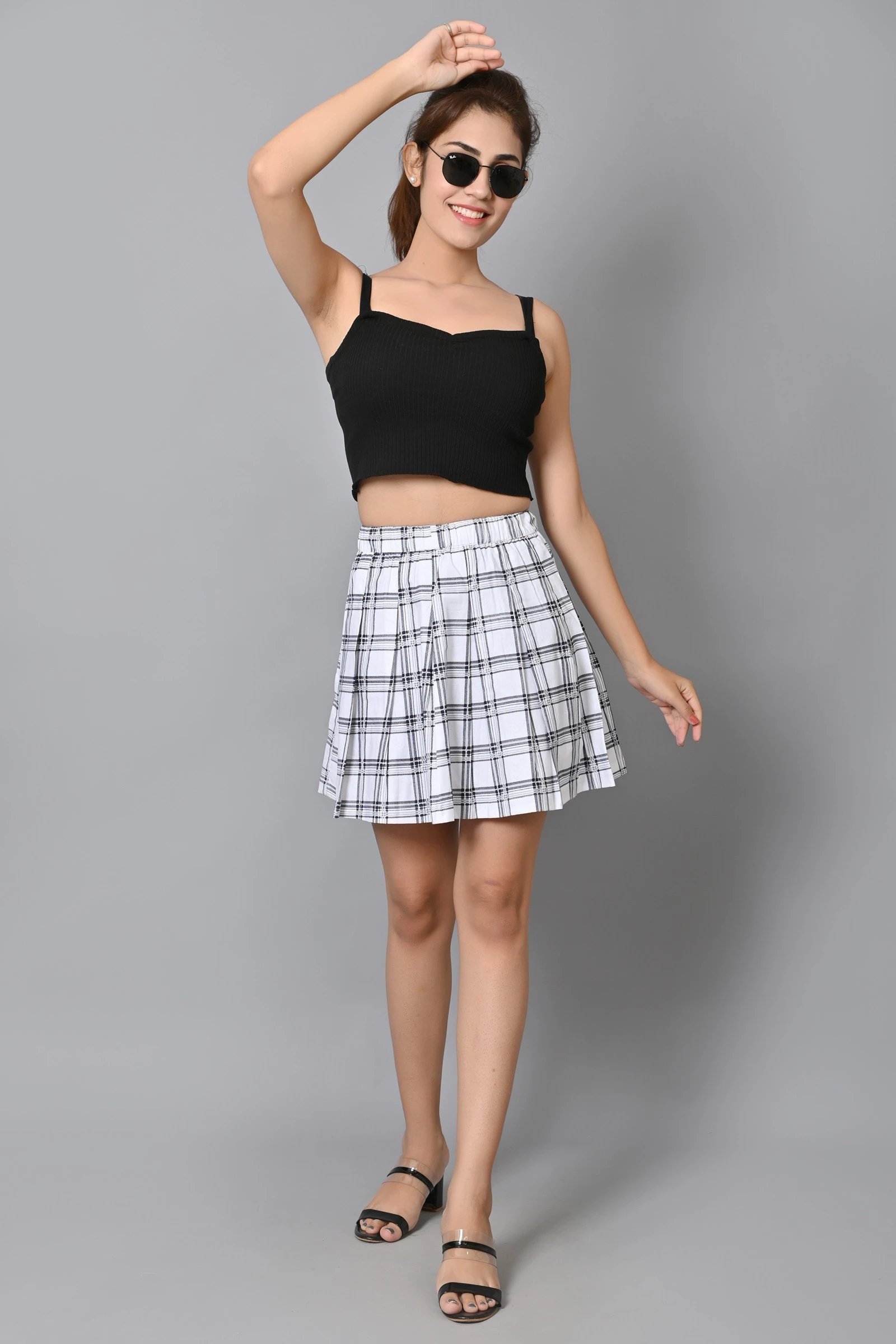 Women Checkered Pleated White Skirt