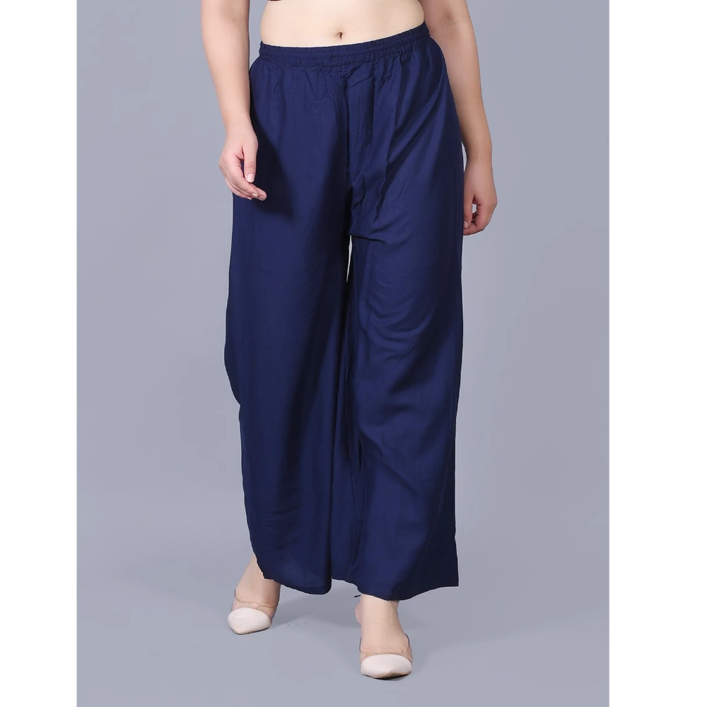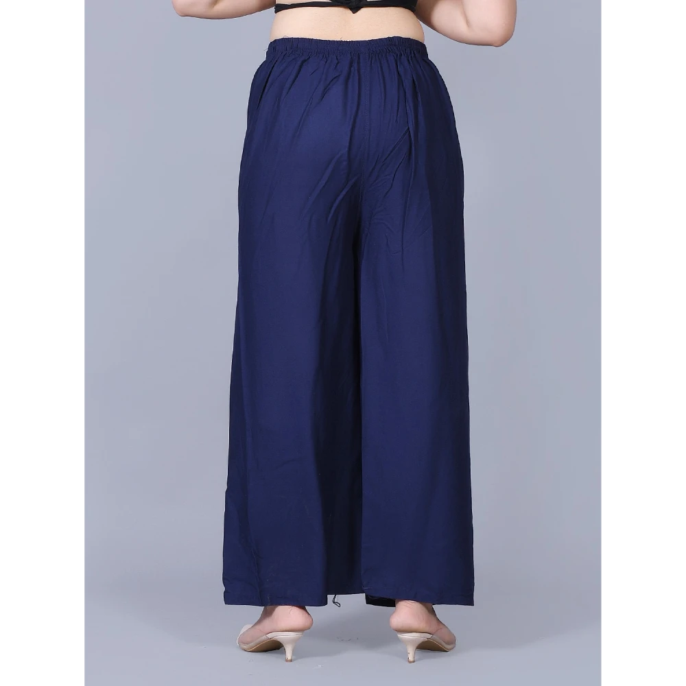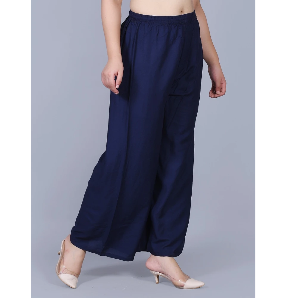 This product is a dark blue palazzo that is perfect for ethnic wear and casual events. It comes in a pack of one and has a flared fit and a solid color. It is made of viscose rayon fabric that is soft and long-lasting. It has an elastic waistband and a mid-rise style. The inseam length is 18 inches and no alteration or belt loops are needed. The fabric should be washed with care and not exposed to direct sunlight.