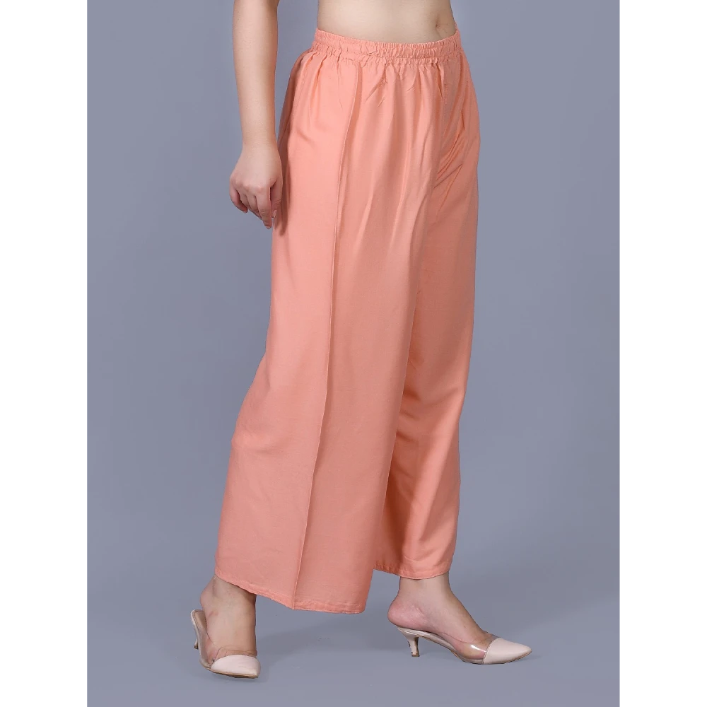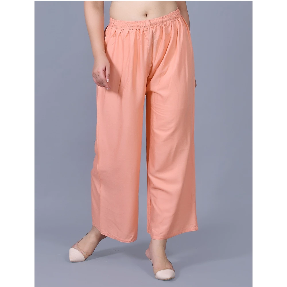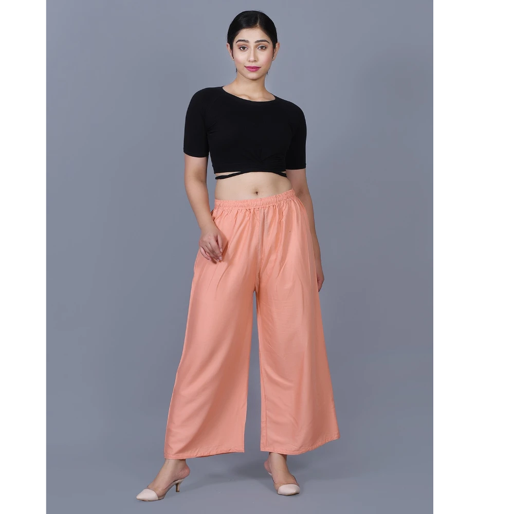 The low-rise cut and solid pattern make these Palazzos a versatile choice, particularly well-suited for enhancing your ethnic wear collection. The charming pink color adds a touch of femininity, transforming your casual ensemble into a captivating style statement. Crafted from premium Viscose Rayon fabric, these Palazzos promise a luxurious and comfortable feel against your skin.