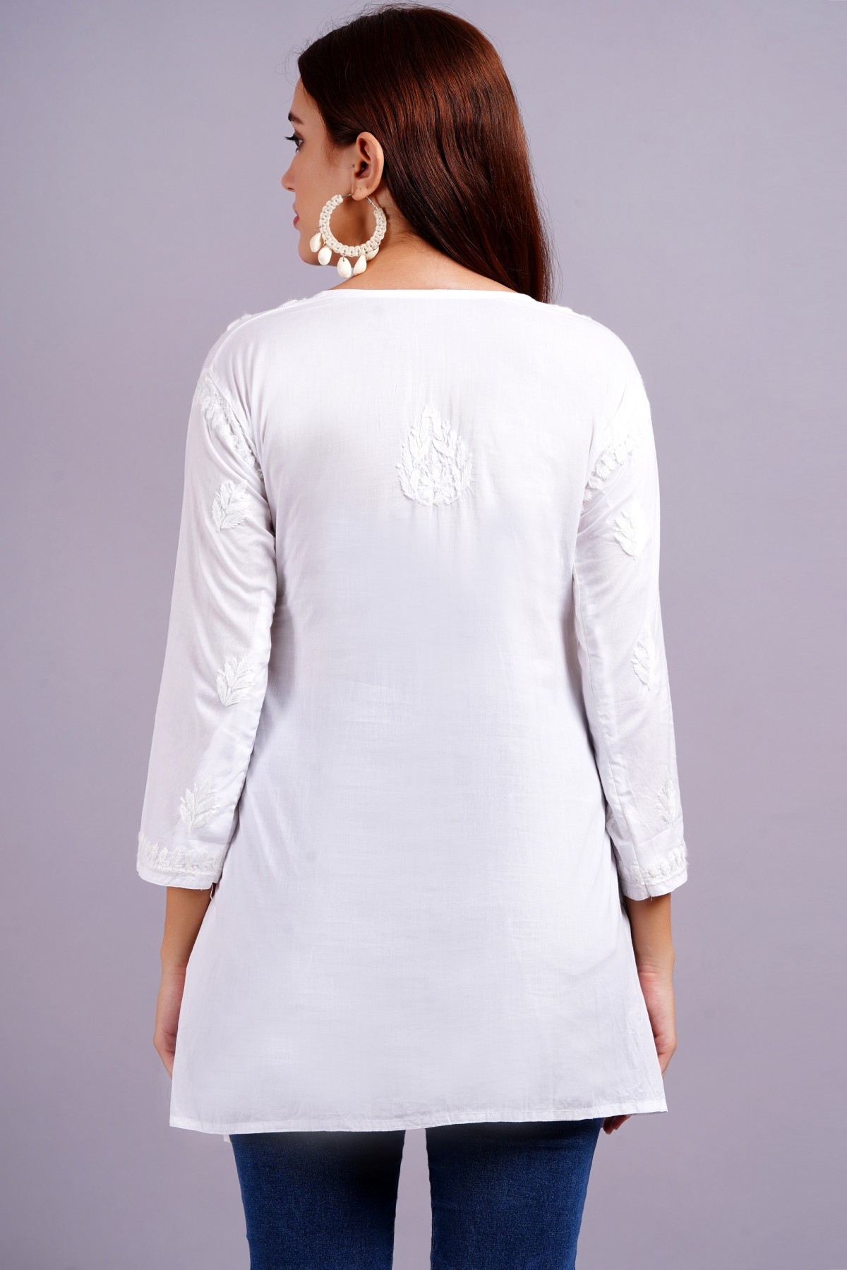 Elevate your ethnic charm with this exquisite black georgette kurti, meticulously hand-embroidered in traditional Lucknowi Chikankari style. Adorned with delicate mirror work, this kurti is a blend of classic artistry and modern elegance. The intricate white thread floral embroidery over sheer georgette fabric offers a luxurious look, ideal for festive gatherings, casual outings, and semi-formal events. Pair it with palazzos, churidar, or straight pants for a graceful ensemble.
