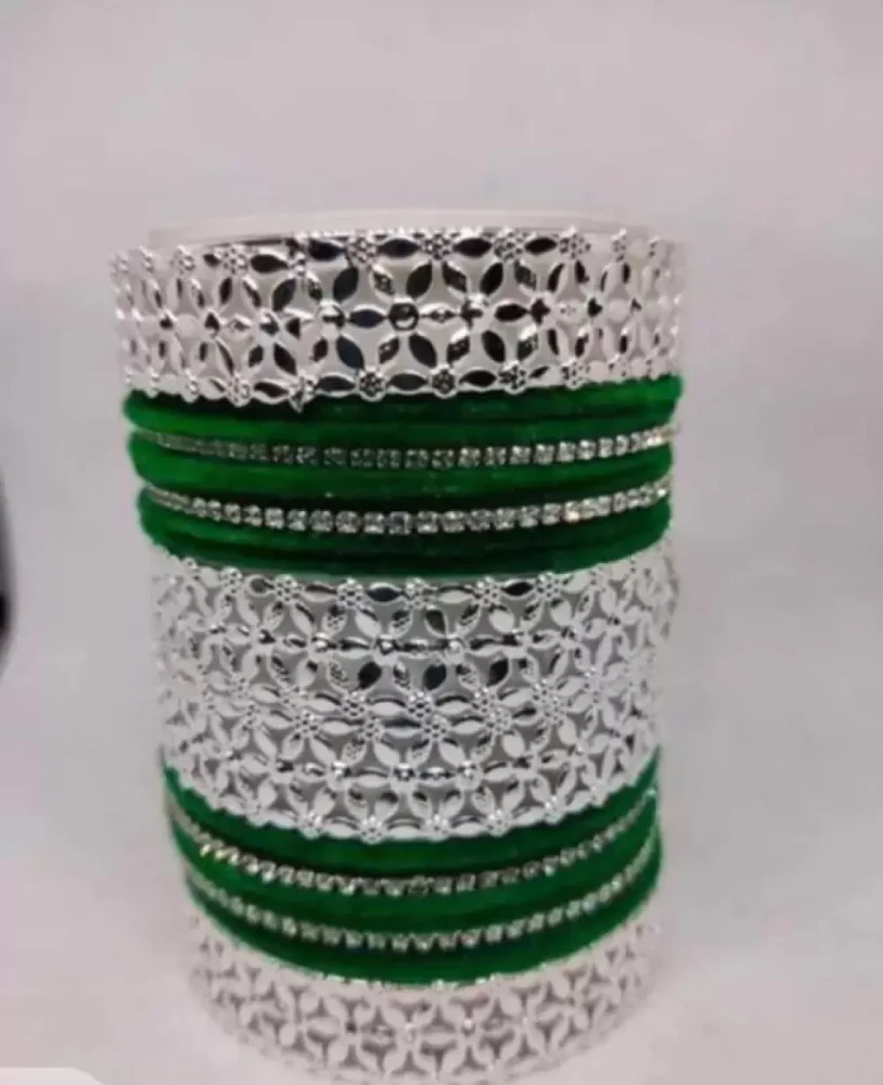 The silver coating enhances the overall look, making these bangles perfect for both special occasions and everyday wear. Embrace the blend of contemporary design and timeless beauty with this stunning green bangle set, an essential addition to any fashion-forward accessory collection.
