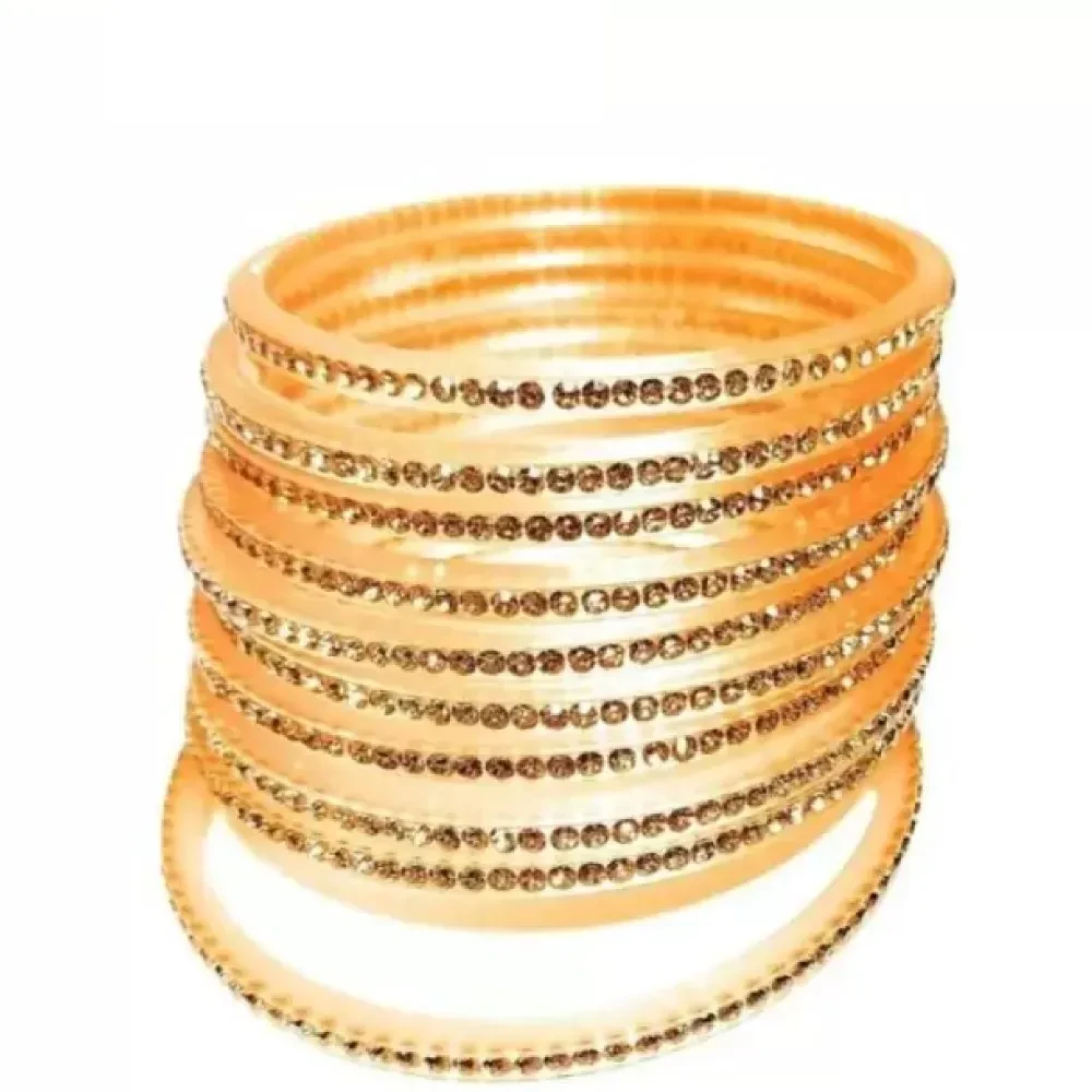 Elevate your accessory collection with the Unique Stone Studded Plastic Bangle Pack of 10. Designed to add a touch of glamour to any outfit, these bangles feature a dazzling golden color that exudes elegance and sophistication. Crafted from durable plastic and adorned with sparkling stone embellishments, these bangles combine lightweight comfort with striking style.