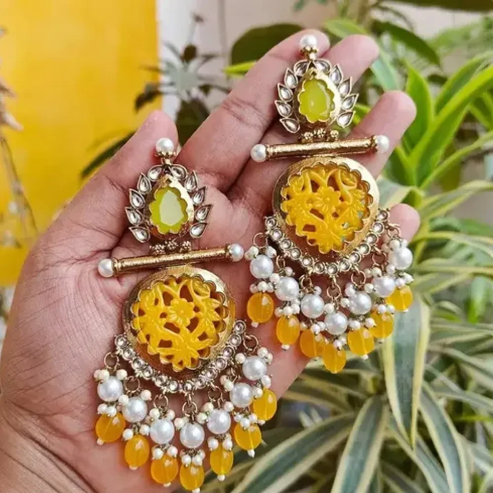 Make a grand entrance with our Latest Chandelier Earrings, where elegance meets extravagance. These stunning pieces are constructed from a durable Alloy base, ensuring they remain a lasting addition to your jewelry collection. The Gold Plated finish imparts a luxurious sheen, reminiscent of the sun's golden rays.