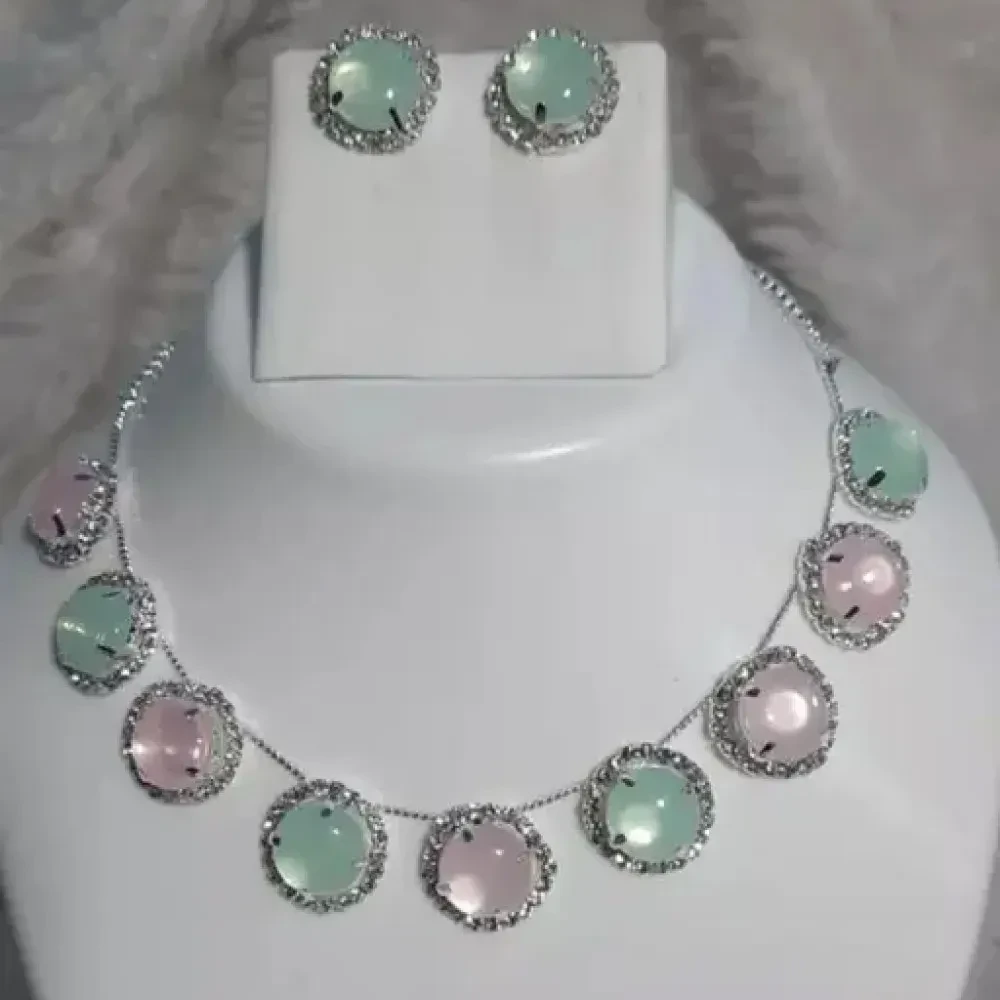 Introducing our New Fancy Necklace Set, a stunning ensemble that promises to add a touch of glamour to your wardrobe. This exquisite set is crafted from a high-quality Alloy base, ensuring durability and a lasting shine. The Silver Plated finish bestows an elegant sheen, reminiscent of moonlight, and provides a versatile backdrop for the sparkling stones.