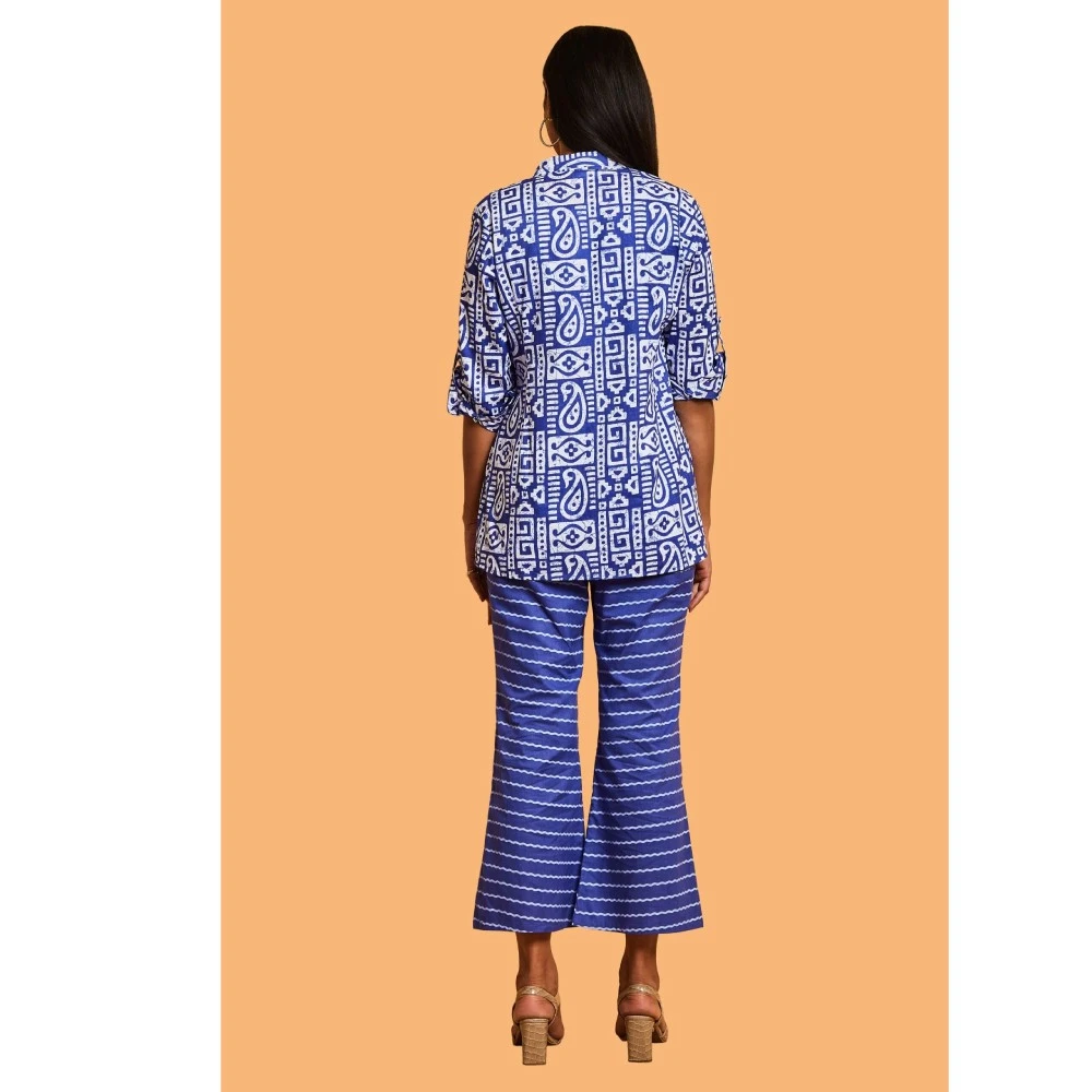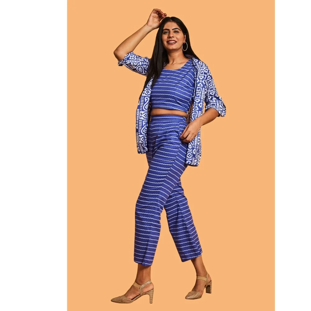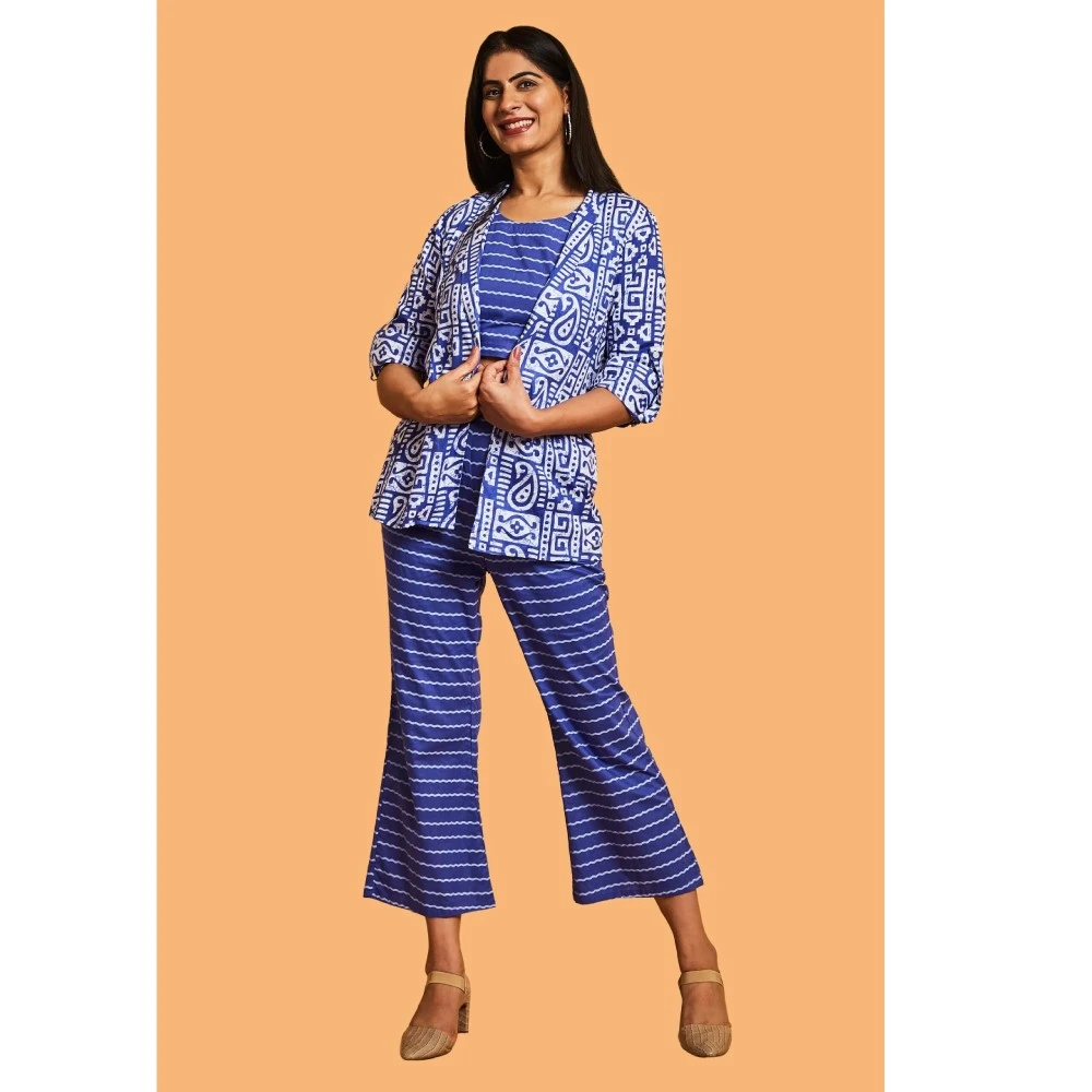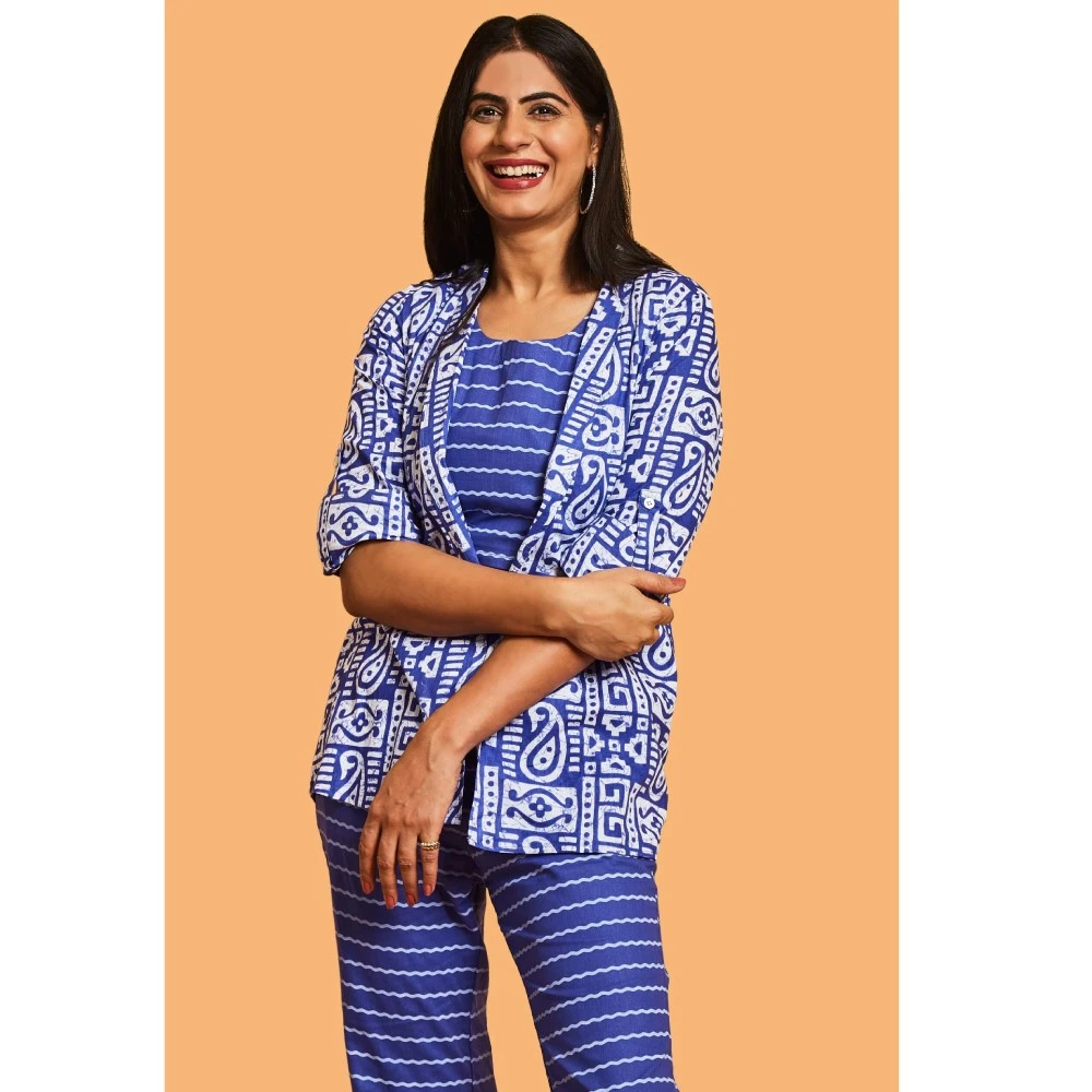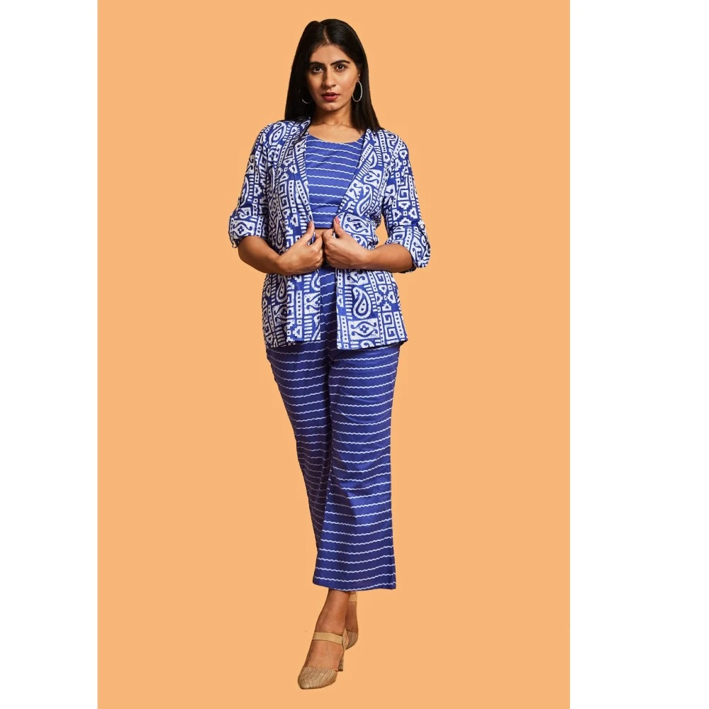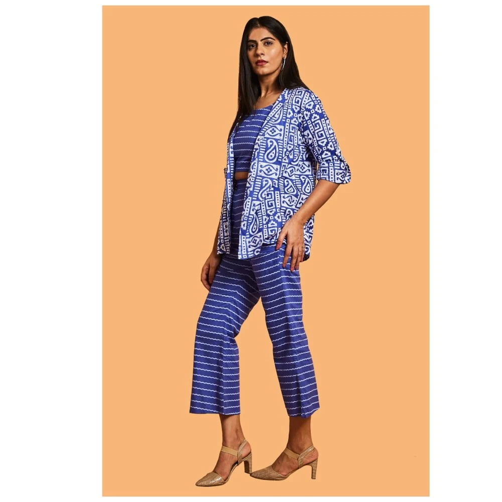 Introducing the epitome of sophistication – Our Elegance Cotton Indigo Blue Three-Piece Set. This opulent ensemble is a masterpiece, featuring an impeccable crop top and pants adorned with a lovely jacket. The U-neckline and slightly raised collar add a touch of elegance to the jacket, creating a look of timeless charm. Perfect for both formal events and casual outings, this versatile outfit is a must-have in the wardrobe of any smart individual.