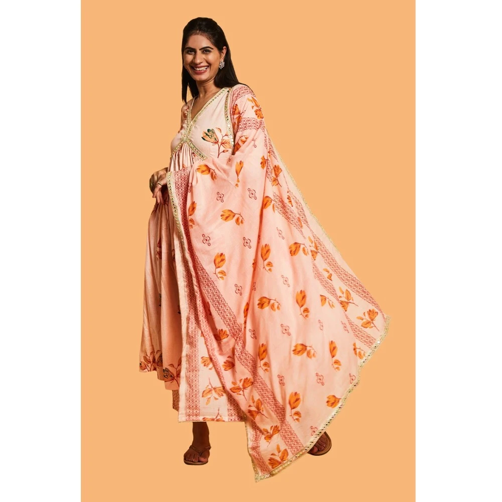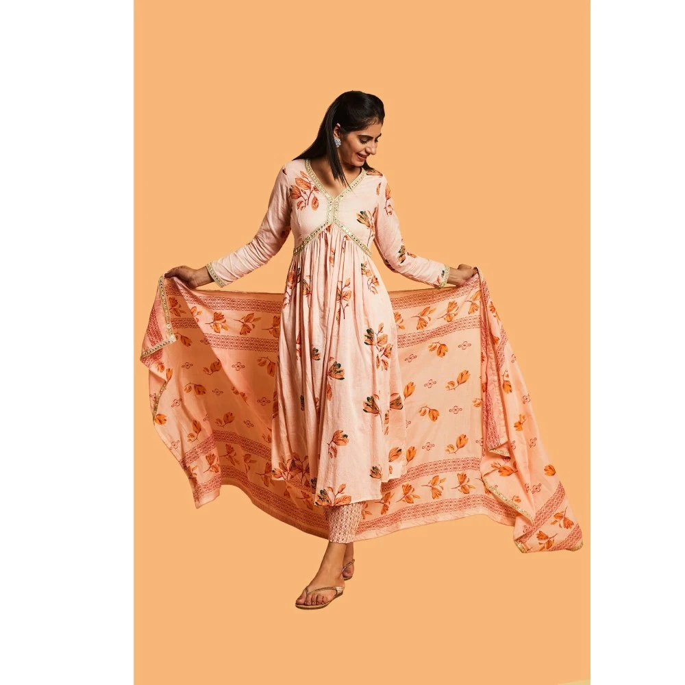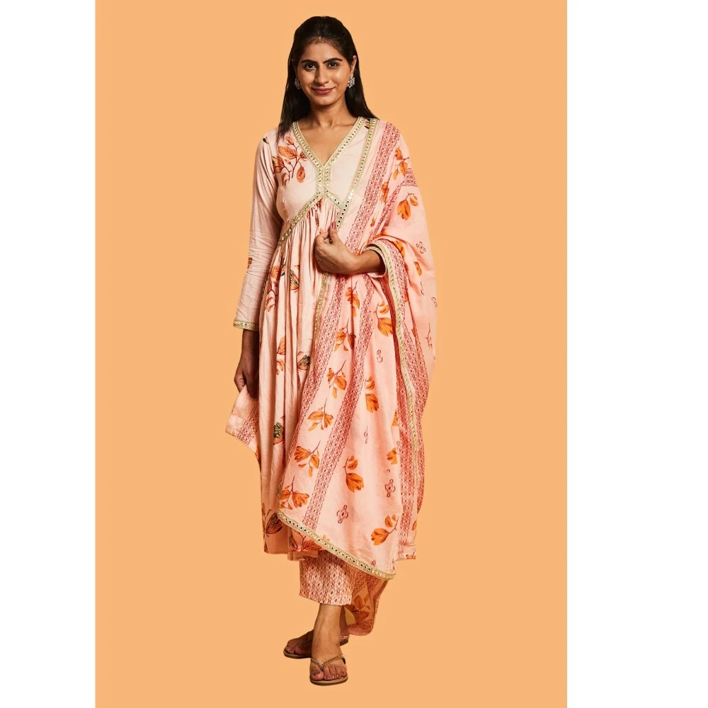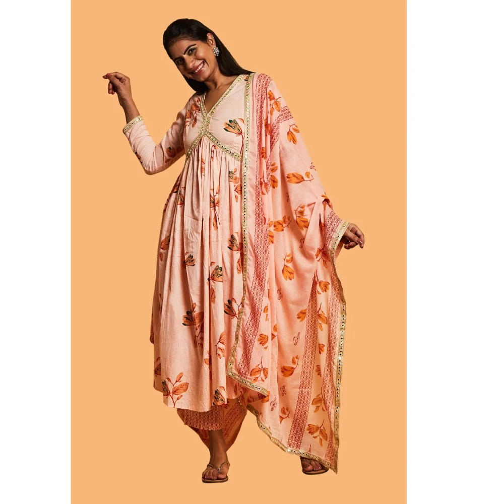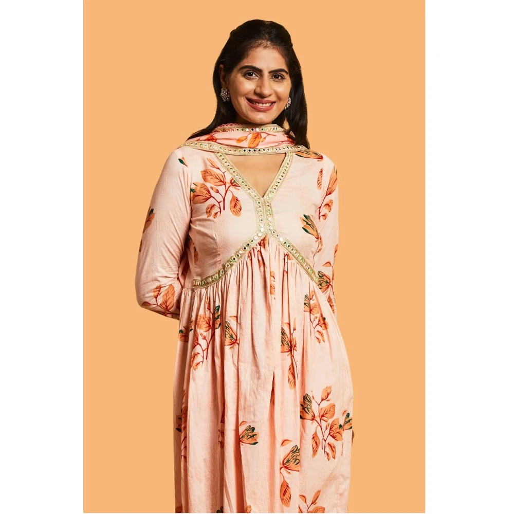 Step into the festive season with elegance in our Peach and Gold Anarkali Suit Set. Make a statement at every celebration with the intricate mirror work detailing on the peach kurta. The ensemble comes together with a matching pair of pants and dupatta, enhancing the grace of your festive look. Complete your outfit with juttis for the perfect finishing touch and step out to celebrate in style. The vibrant multi-color mirror work on the neck and dupatta adds an extra layer of vibrancy and charm, elevating your festive style.
