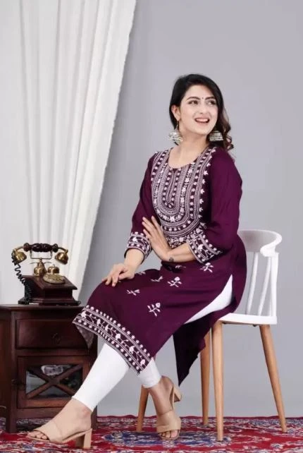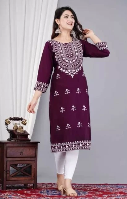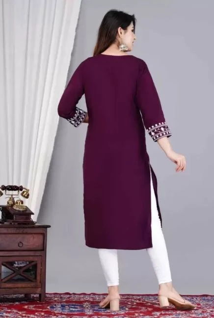Immerse yourself in the rich and regal allure of the Wine color, elegantly combined with Purple and White to create a sophisticated color palette that stands out. The embroidered pattern adds a touch of grace to this Straight Kurta, making it an ideal choice for various casual occasions.
